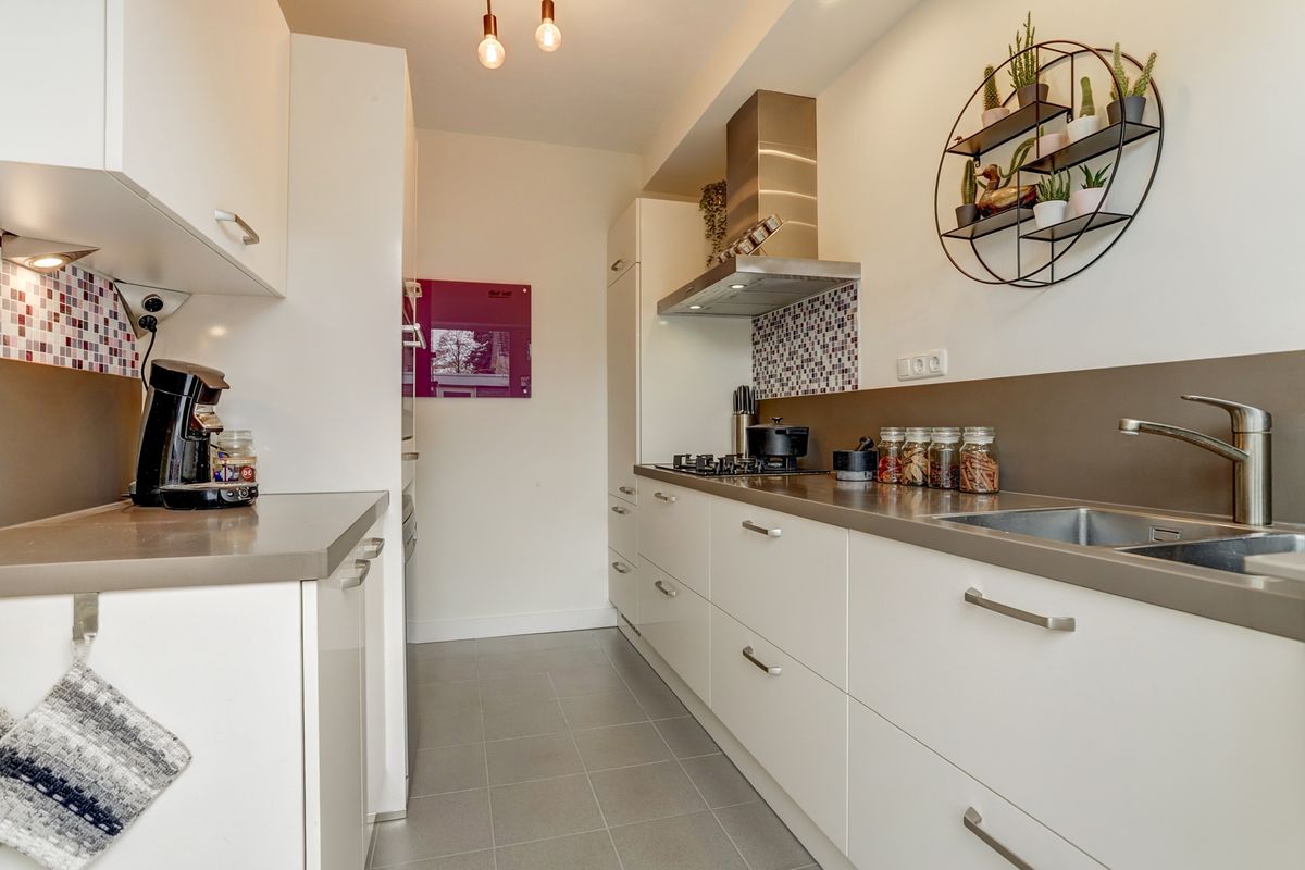 Aan de achterzijde van de woning bevindt zich de halfopen keuken, die in 2017 volledig is vernieuwd. De keuken heeft een frisse, moderne uitstraling met hoogglans witte kastjes en een mooi werkblad wat is geplaatst in een dubbele wandopstelling. De keuken is uitgerust met een 4-pits gaskookplaat, afzuigkap, combi-oven en koelkast met vrieslade. Via de achterdeur heb je direct toegang tot de achtertuin.