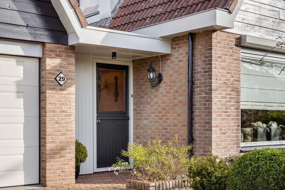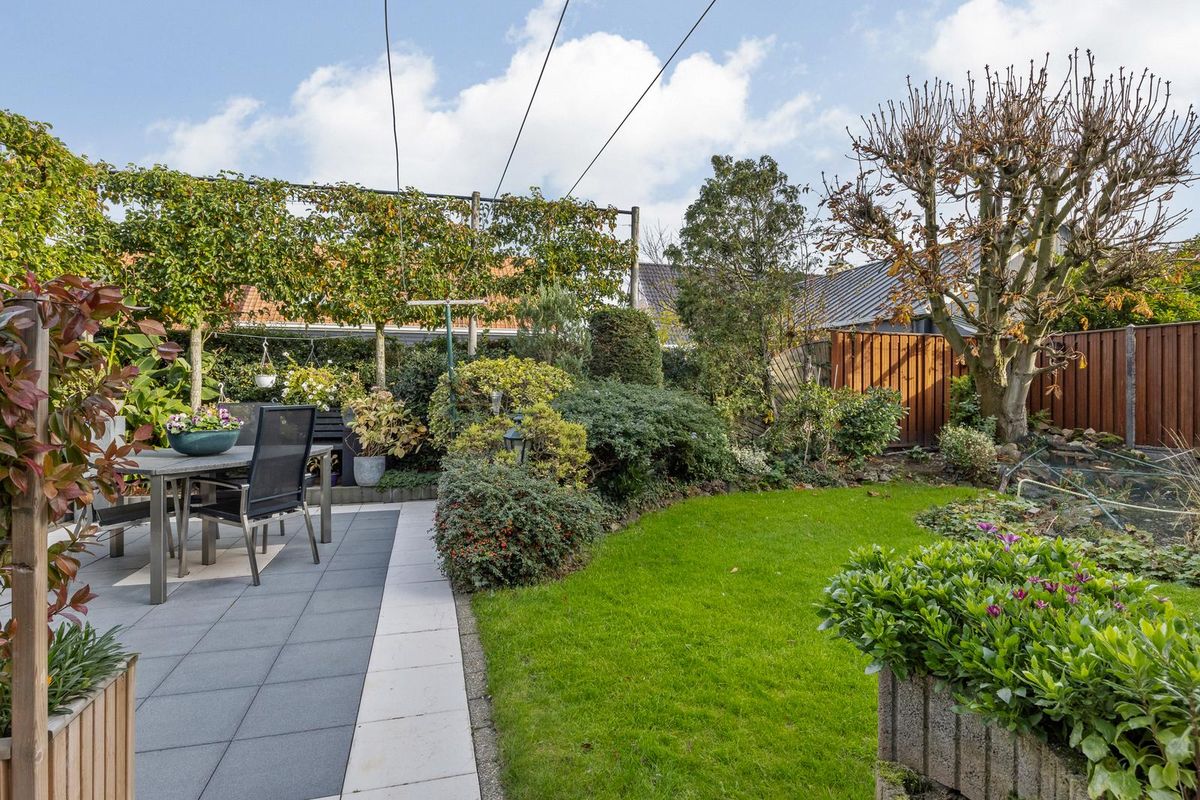 De voortuin heeft een plantenborder met diverse beplanting, struiken en bomen, een oprit naar de garage en een tuinpad met sierbestrating langszij, naar de achtertuin.