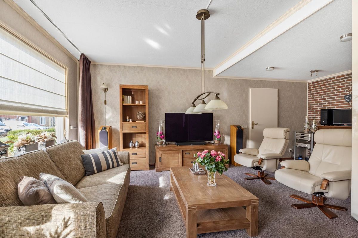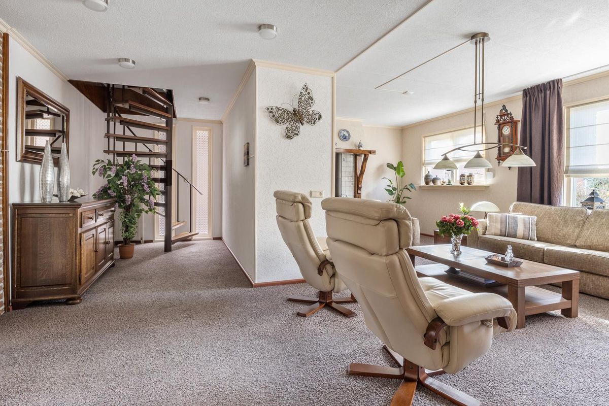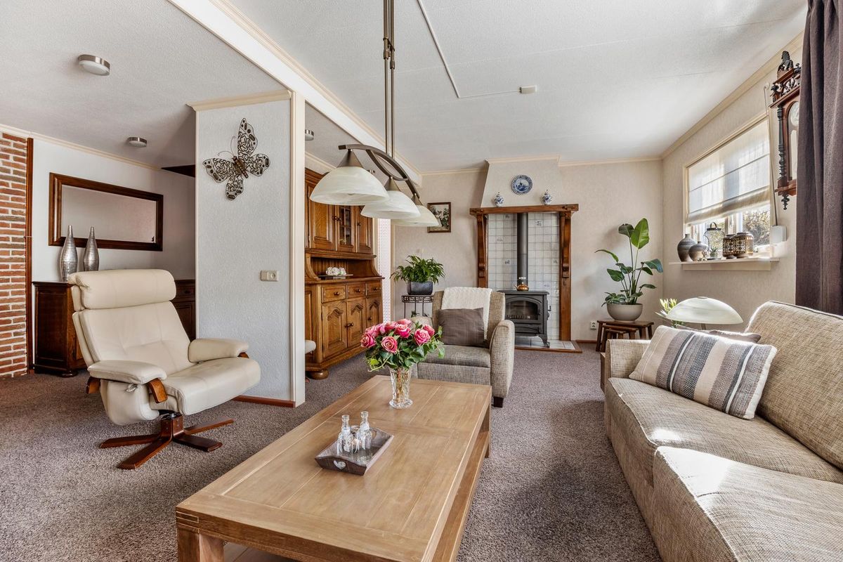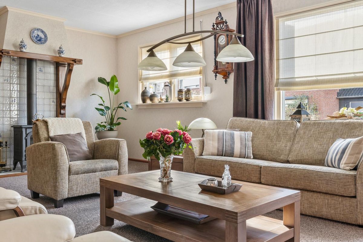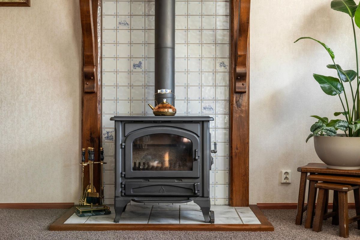 De ruime en huiselijke woonkamer heeft een sierlijke schouwpartij met houtkachel (ter overname), rolluiken aan de voorzijde, een wenteltrap naar de verdieping en een deur naar de woonkeuken.