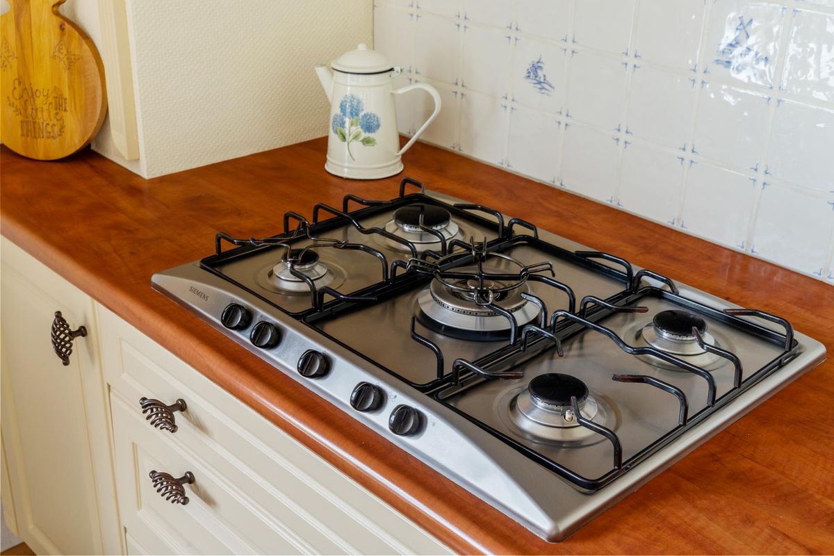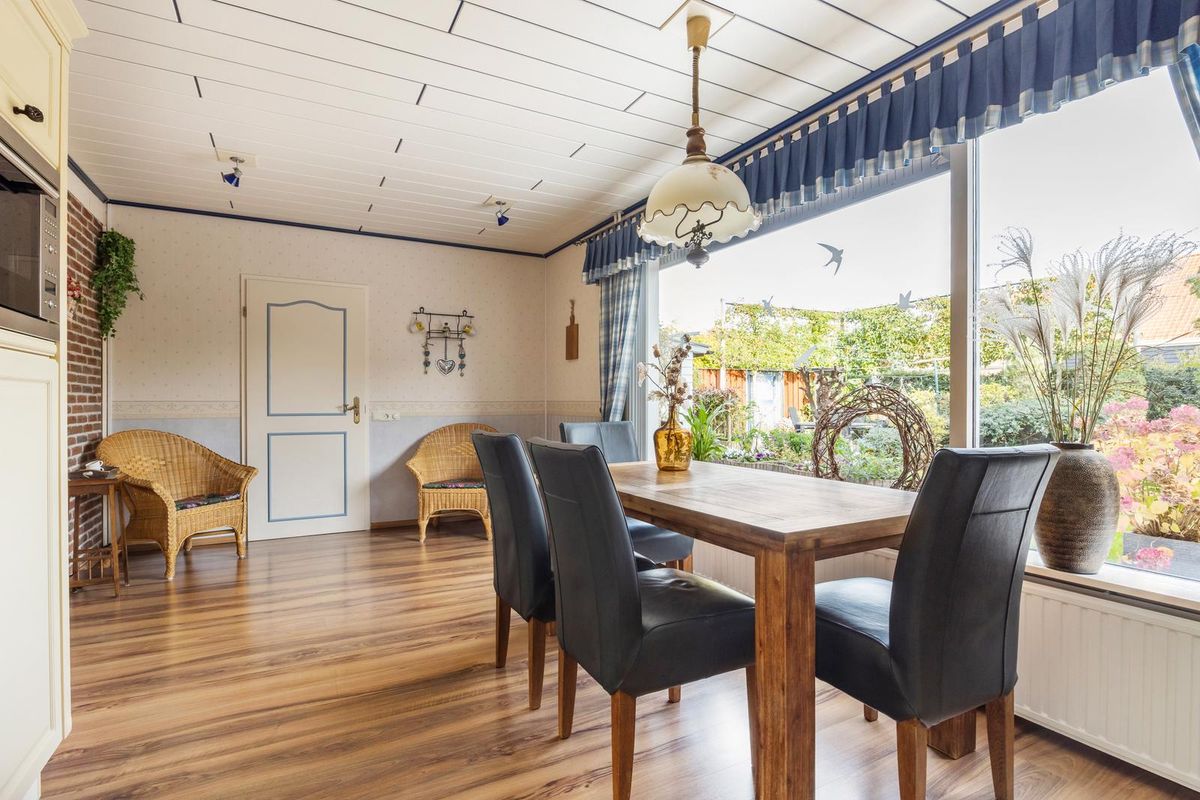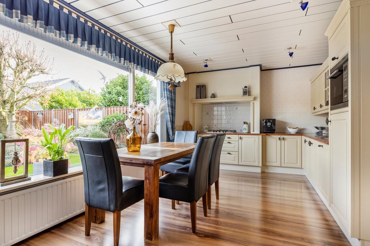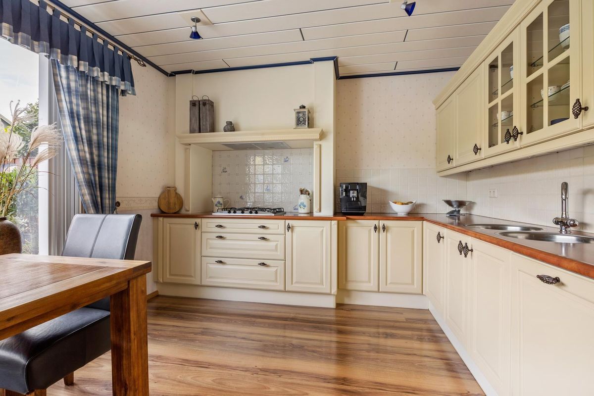 De keuken is in hoekopstelling geplaatst en uitgerust met een 5-pits gaskookplaat, afzuigschouw, combioven-magnetron, koelkast, vaatwasser, dubbele spoelbak met close-in boiler en bovenkasten. Er is een deur naar de bijkeuken en je hebt er een mooi uitzicht op de tuin.
