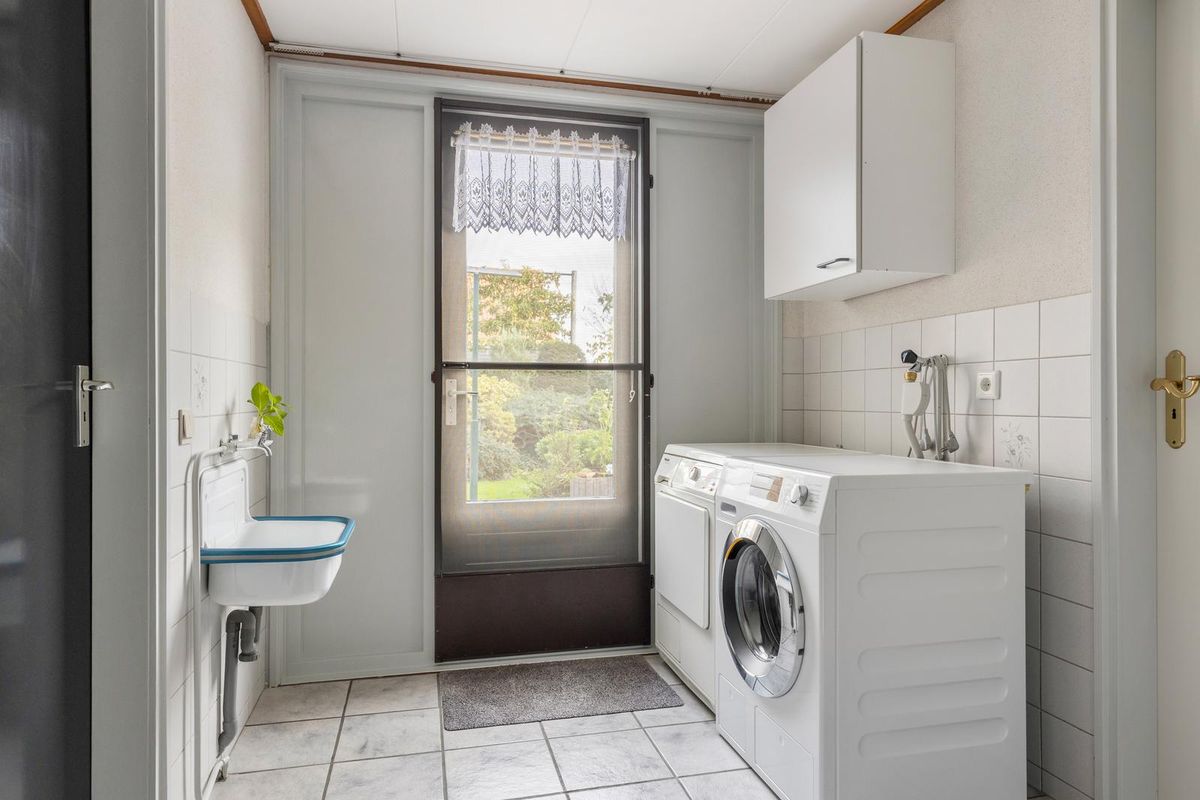 Deels betegelde bijkeuken met de aansluitingen voor wasmachine en droger, stortbak, deur naar de garage en een achterdeur.