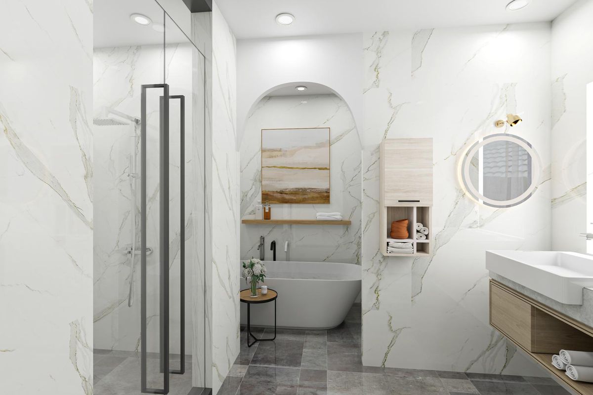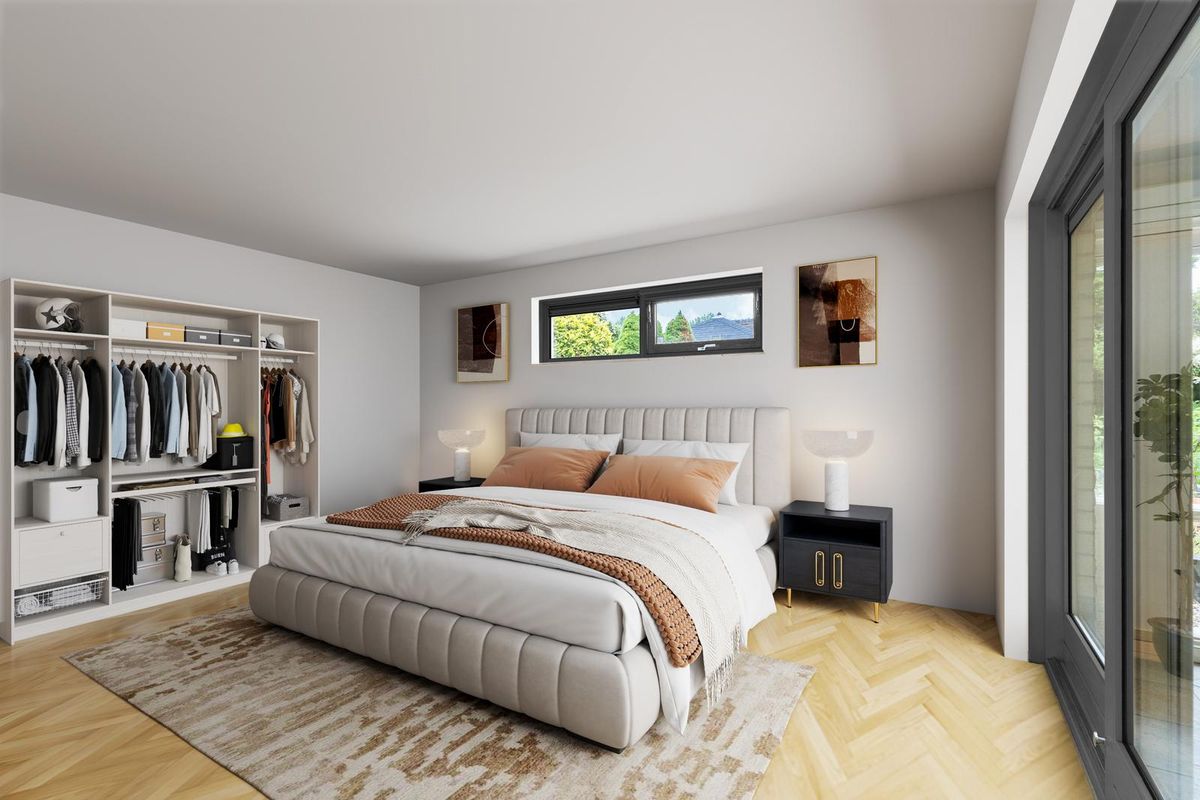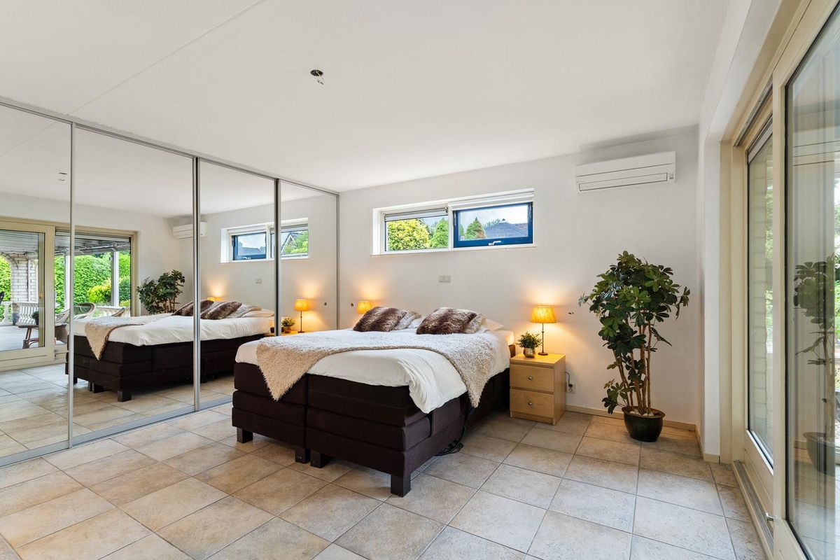 Aan de linkerzijde van de woning bevindt zich de royale master bedroom met praktische inbouwkasten, airconditioning, schuifpui naar het overdekte terras en een en-suite badkamer. Deze is uitgerust met een ruime douche met dubbele zitjes, wastafel met meubel en spiegel, een toilet, radiator én aansluitingen voor wasmachine en droger. Indien gewenst, is er de mogelijkheid om vanuit de hal een extra toegang tot deze badkamer te realiseren, waardoor deze ook separaat toegankelijk wordt.