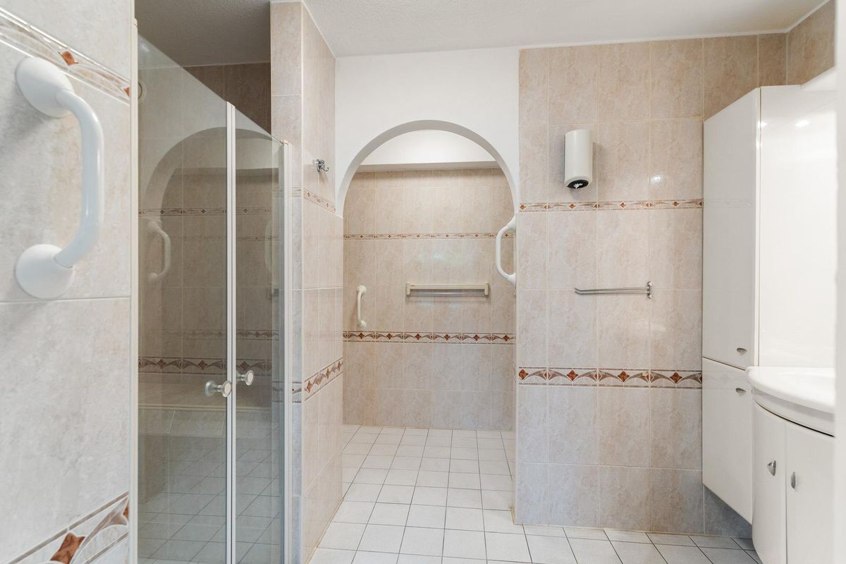 On the left-hand side of the house you’ll find the spacious master bedroom with built-in wardrobes, air conditioning, sliding doors to the covered terrace, and a private en-suite bathroom. The bathroom features a large shower with double seats, washbasin with cabinet and mirror, toilet, radiator, and connections for a washer and dryer. If preferred, an extra access point can be created from the hallway, making this bathroom separately accessible.