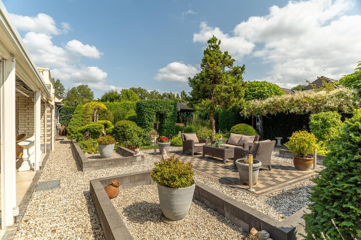 De voortuin loopt via de zijkant over in de achtertuin. De achtertuin is gelegen op het zuidoosten en is werkelijk een oase van rust en ontspanning: met een tweede overkapping waarin een 8-persoons jacuzzi staat, een buitendouche én zelfs een Jeu de Boules-baan. Er zijn meerdere elektra- en waterpunten, sierbestrating, en sfeervolle tuinverlichting. Alles wat u nodig heeft om hier optimaal te genieten van het buitenleven. Wees niet verbaasd als u ineens oog in oog staat met een ree of vos. Hier woont u midden van natuur en water en is puur genieten!