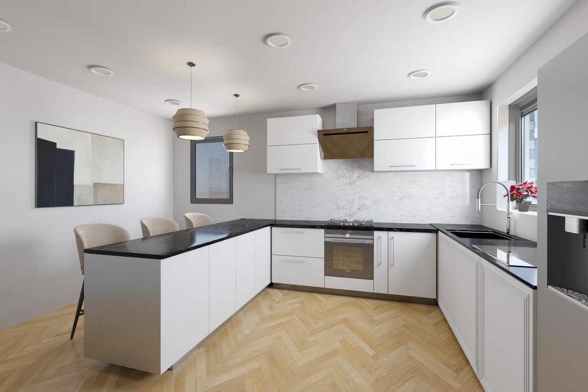 De keuken is van alle gemakken voorzien: een oven (geplaatst in 2022), magnetron, koel-vriescombinatie, vaatwasser en een 4-pits inductiekookplaat met afzuigkap. Grenzend aan de keuken bevindt zich de praktische bijkeuken voor extra opbergruimte en een wateraansluiting. Deze ruimte kan, indien gewenst, eenvoudig bij de keuken of de naastgelegen kamer betrokken worden om extra leefruimte te creëren.