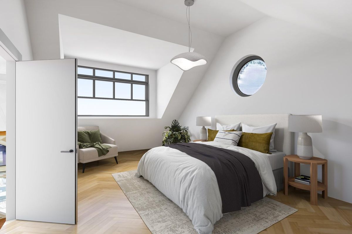 The first floor has a playful, open layout with a central bridge. On either side, there is space to create two bedrooms, with washbasin connections and built-in wardrobes already in place. In addition, there is a bedroom with a dormer window, washbasin, and access to a wonderful private roof terrace at the rear. A door to a potential second roof terrace at the front has already been installed, making this easy to realize.