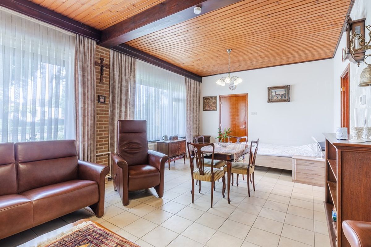 Ruime entreehal (10 m²) met trapopgang en meterkast. Toegang tot de gesloten keuken (15 m²) met gaskookplaat, afzuigkap en koelkast. De keuken staat in verbinding met de L-vormige woonkamer, afgewerkt met een tegelvloer en voorzien van prettig daglicht.