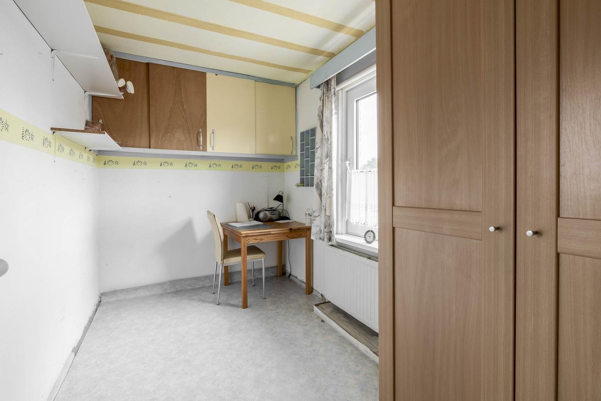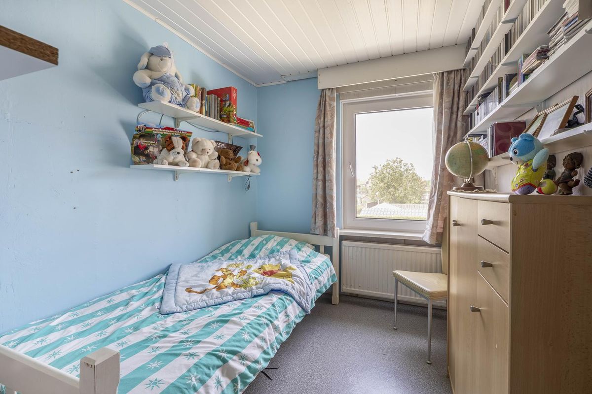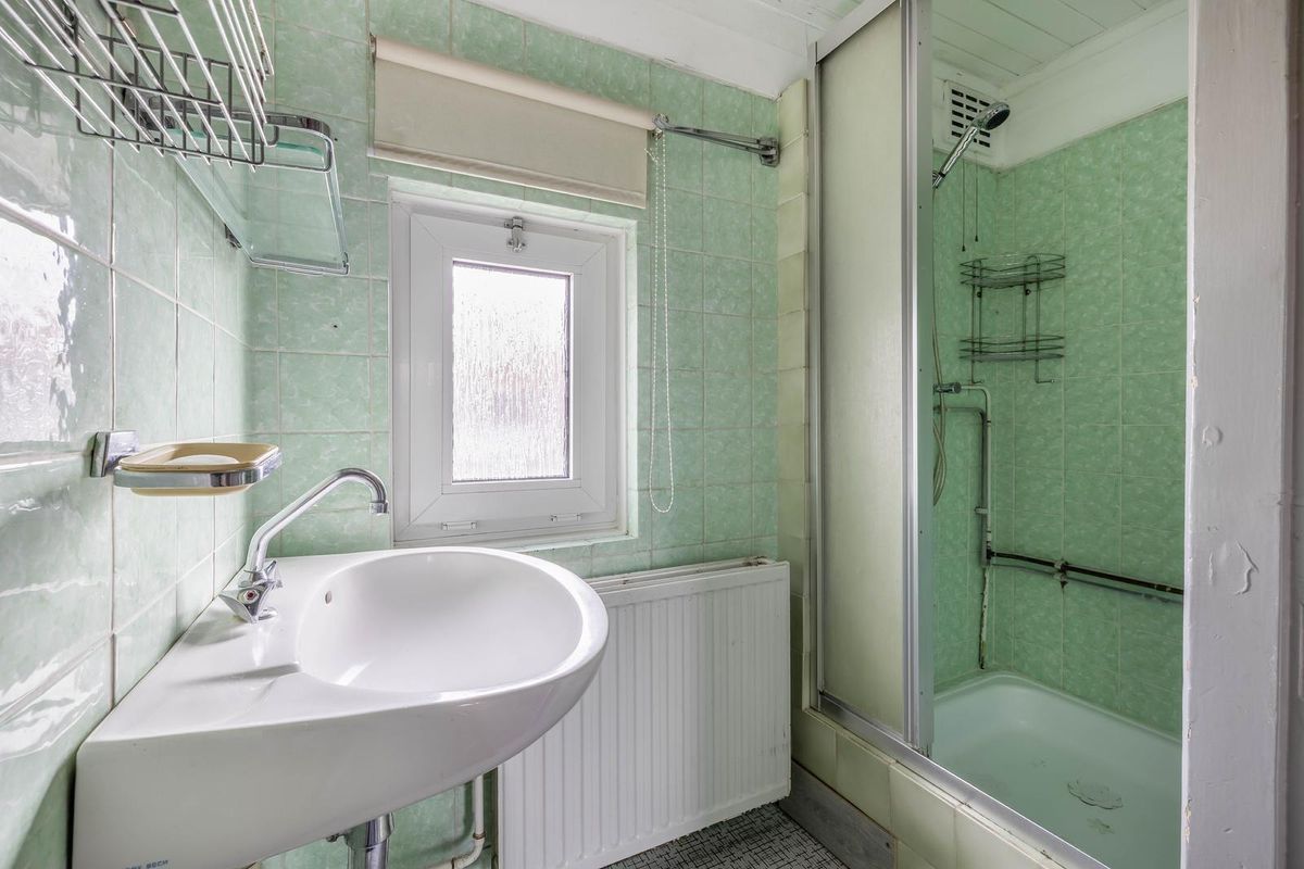 Op de verdieping bevinden zich drie slaapkamers van ca. 14m², 6,5m² en 5,5m². De badkamer is compact, volledig betegeld en voorzien van douche en wastafel. Verder beschikt de overloop over extra bergruimte waar de CV-ketel en een luik naar de vliering zijn geplaatst.