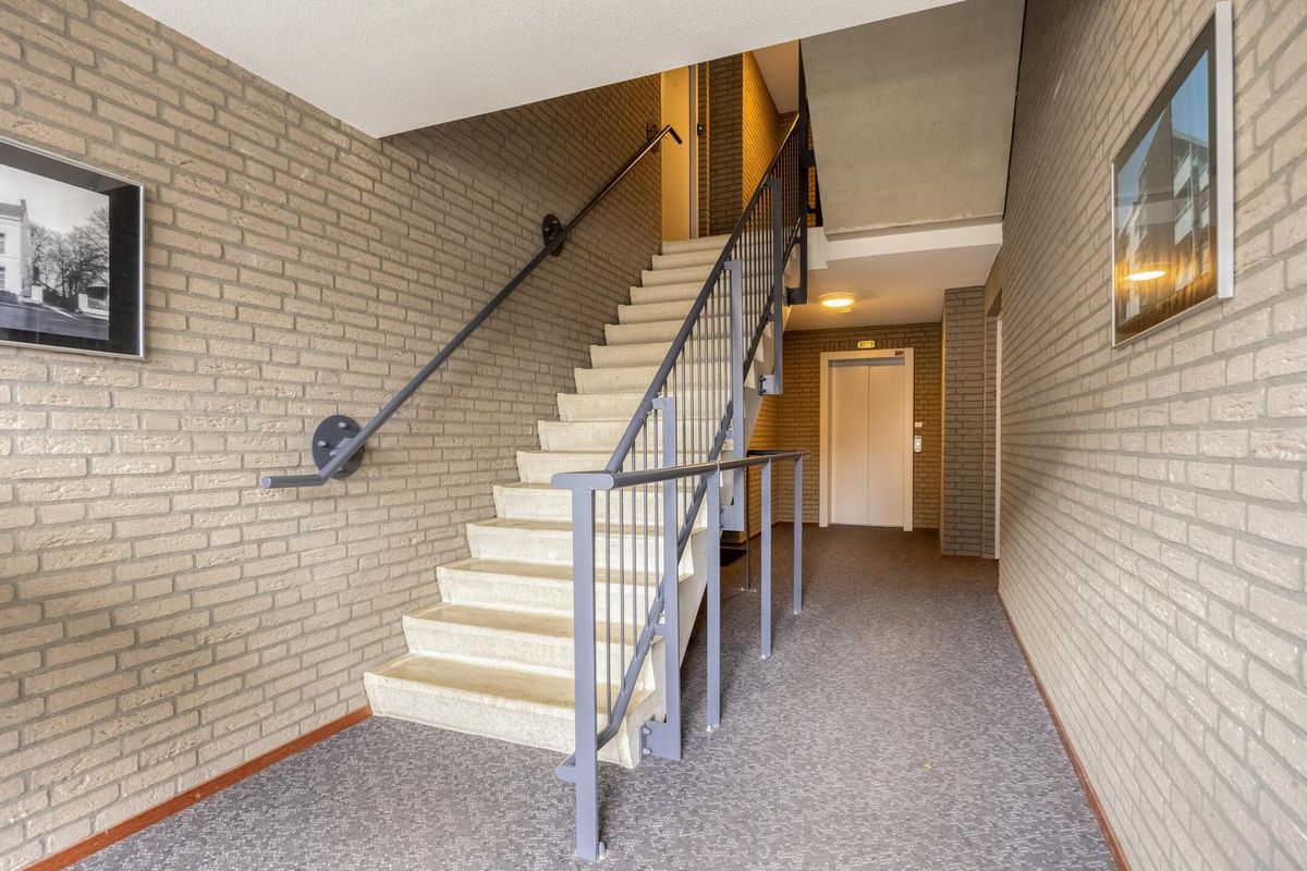 De centrale entree met bellentableau, brievenbussen en is v.v. een lift en een trap voor de hoger gelegen verdiepingen. Er zijn drie woonlagen met 21 wooneenheden 21 bergingen en 15 overdekte parkeerplaatsen en 14 parkeerplaatsen op het afgesloten binnenterrein.