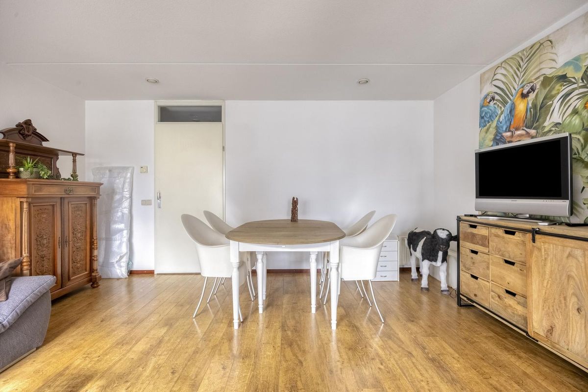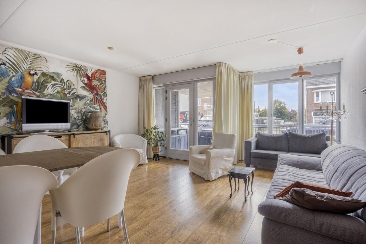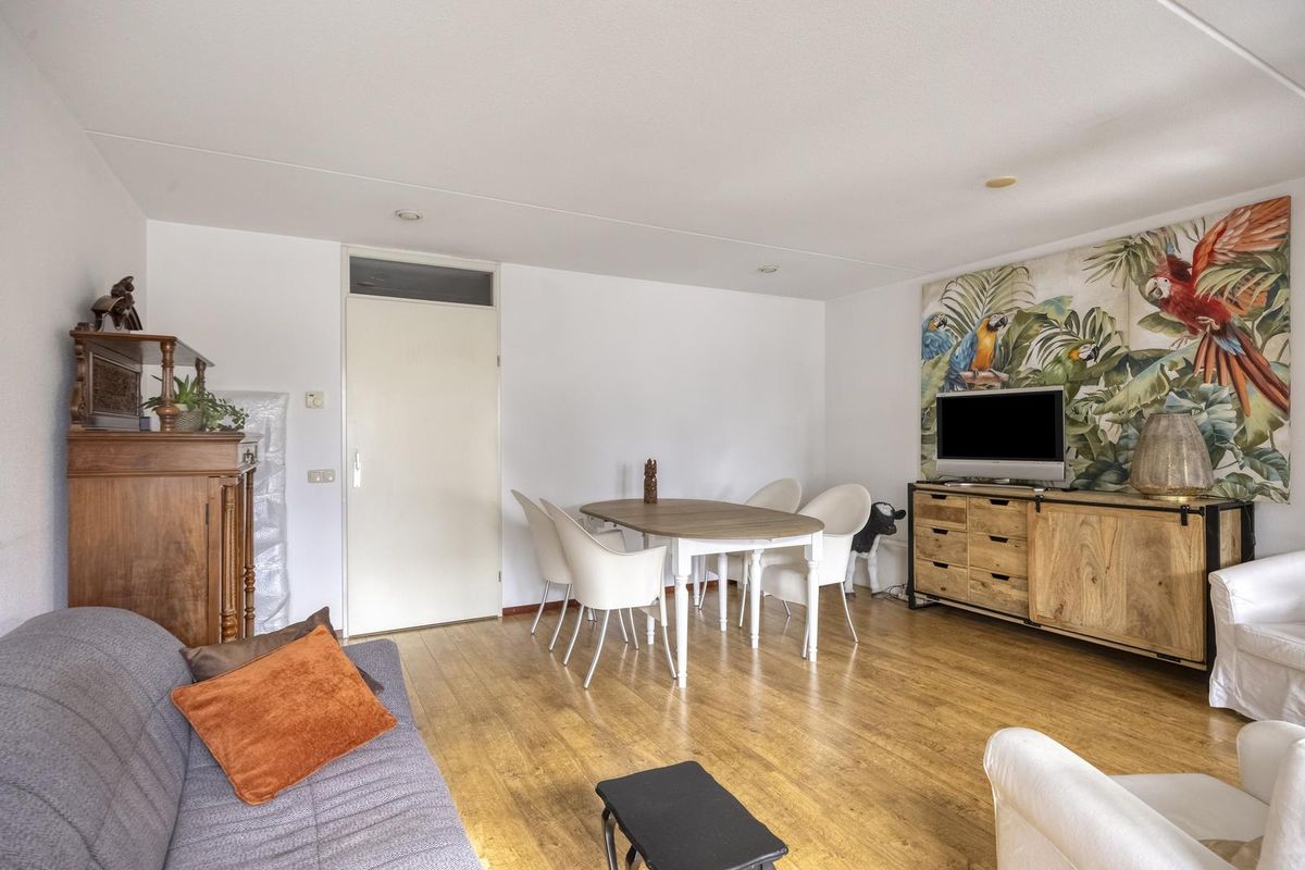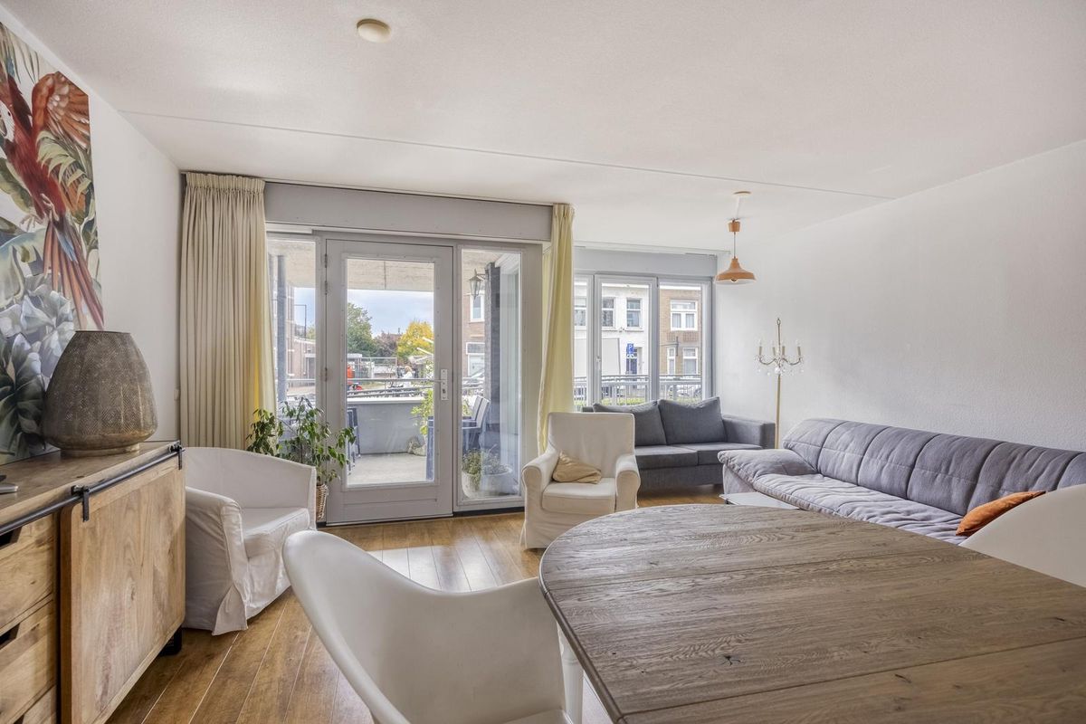 De woonkamer (29m²) heeft een groot raam en er is een toegangsdeur naar het overdekte balkon.