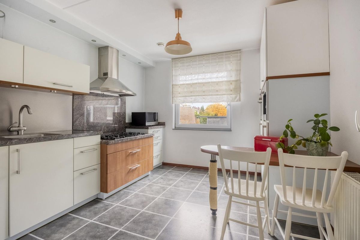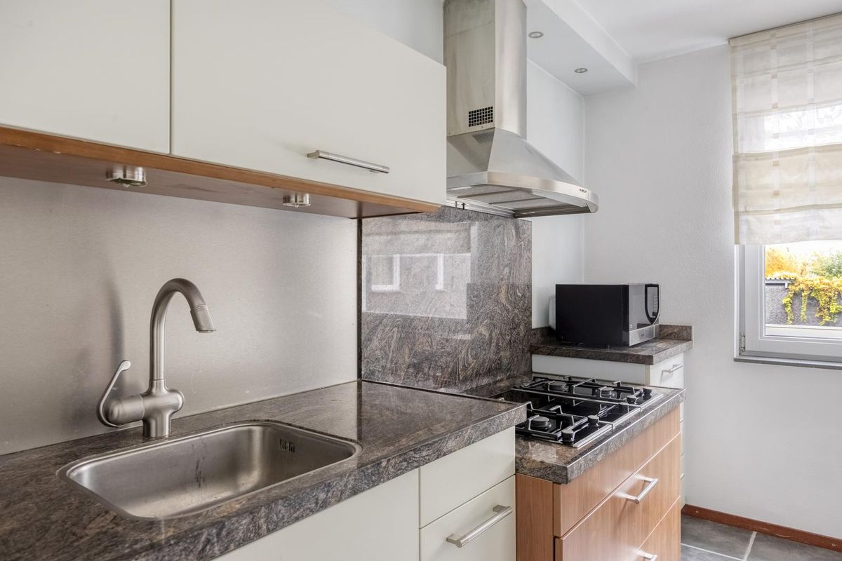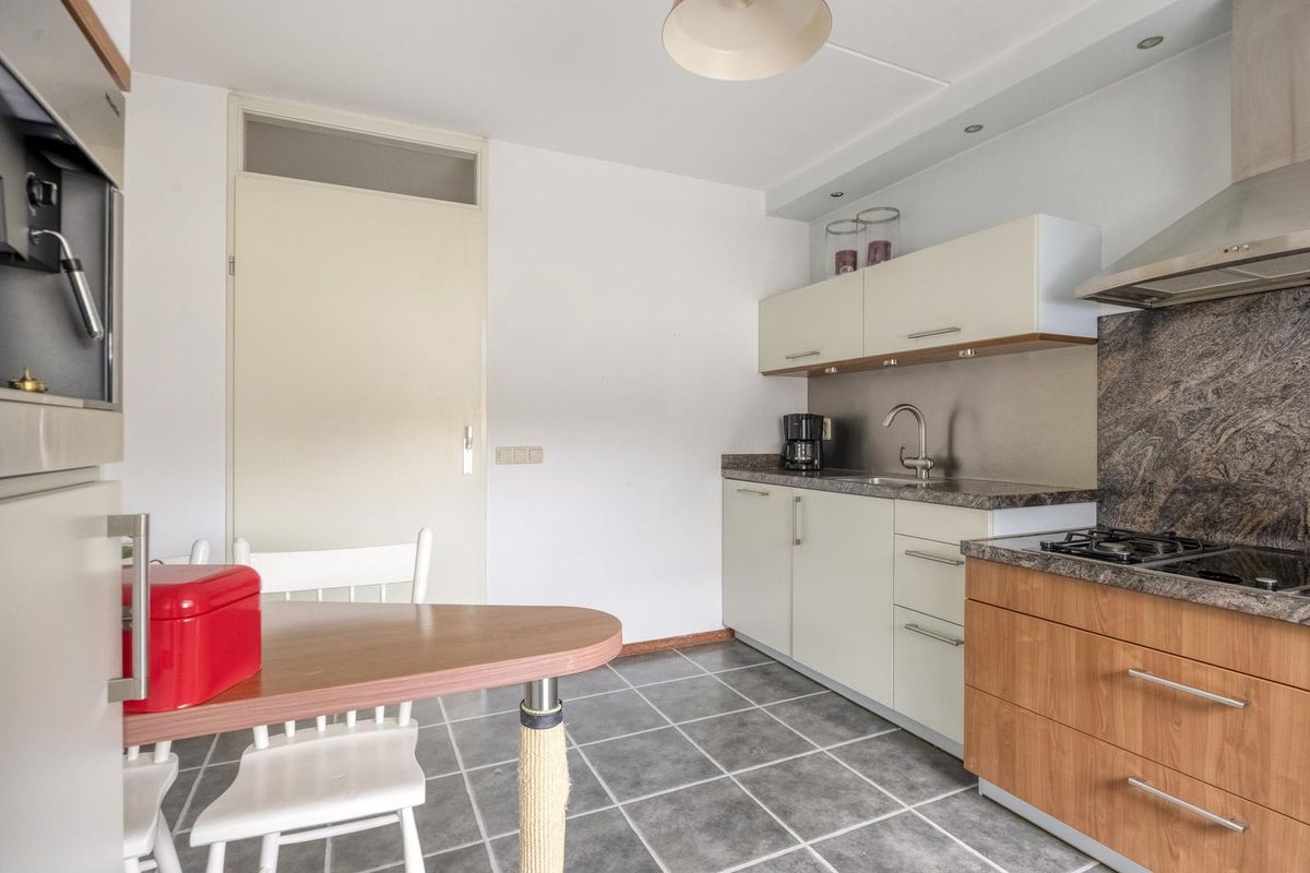 De gesloten keuken (11,3m²) is keurig afgewerkt met boven en onderkastjes.