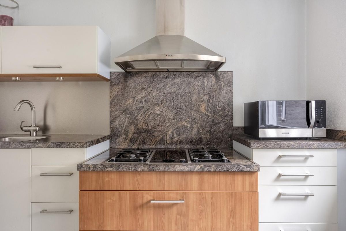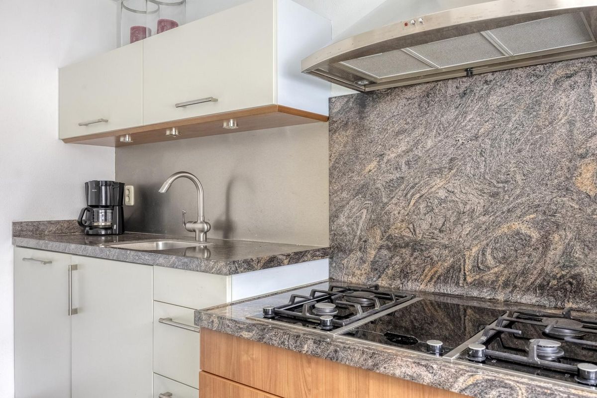 De keuken met granieten werkblad is v.v. diverse inbouwapparatuur: een vaatwasser, koelkast, diepvries, 4 pits gaskookplaat met afzuigkap, een ingebouwde friteuse en een combi oven-magnetron.