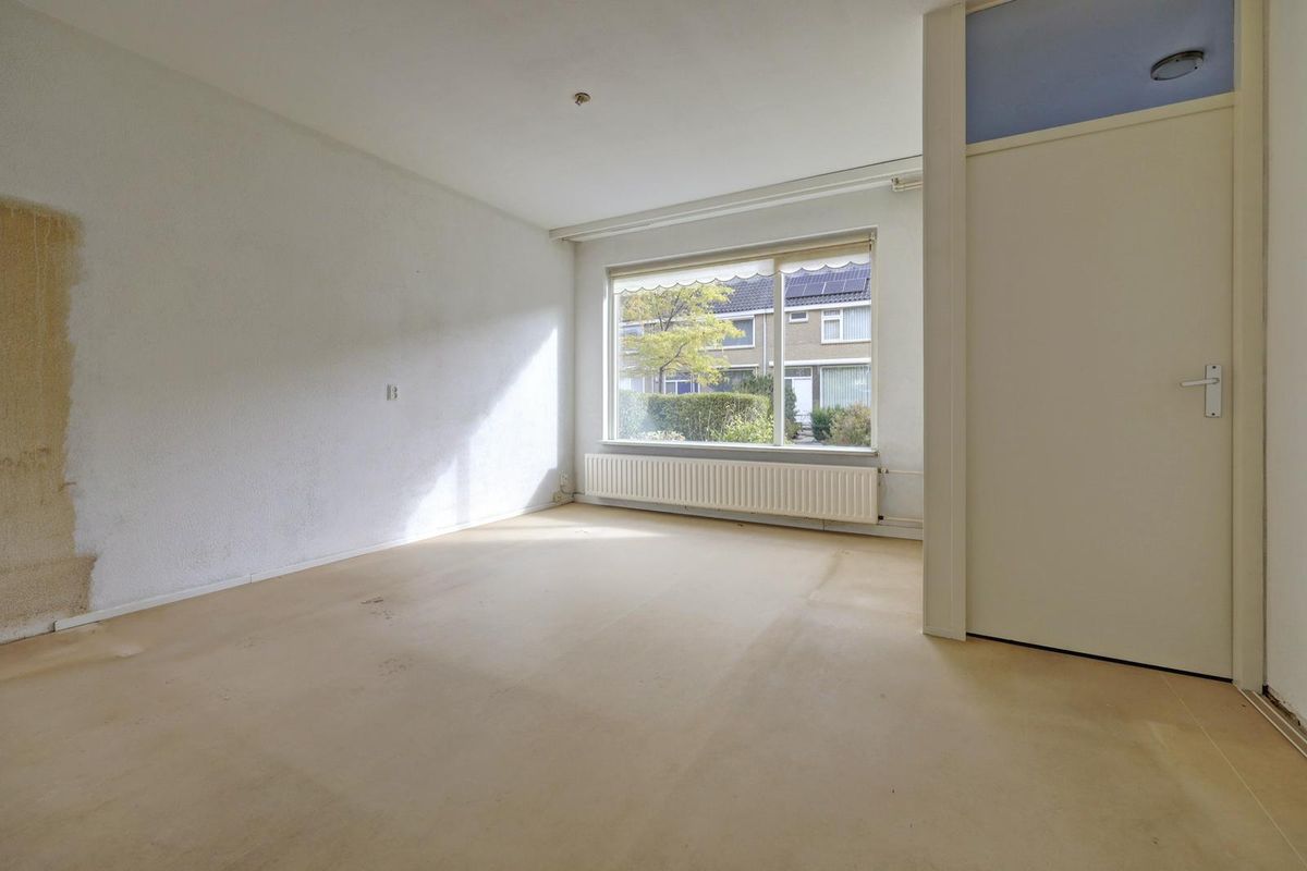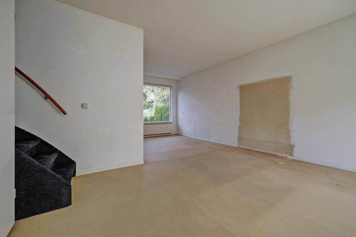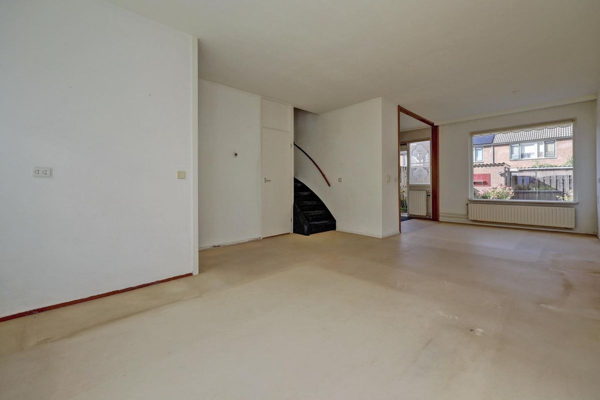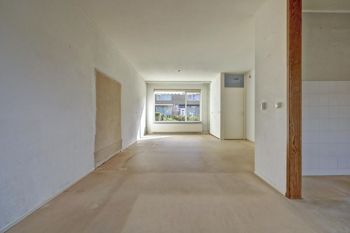 De ruime woonkamer heeft veel lichtinval en is voorzien van een vaste bergkast onder de trap naar de eerste verdieping. De wanden zijn afgewerkt met spachtelputz, de vloer met marmoleum en het plafond is voorzien van spuitwerk. De woonkamer loopt aan de achterzijde over in de open keuken.
