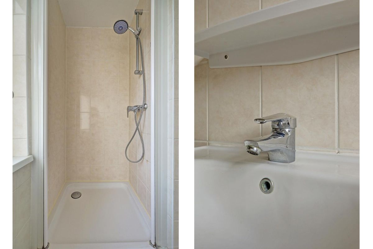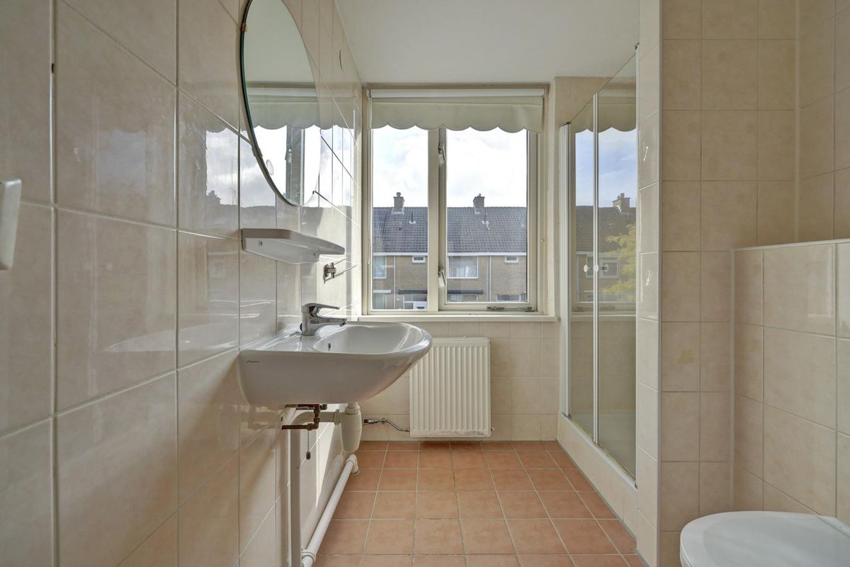 De nette badkamer ligt aan de voorzijde van de woning is geheel betegeld in licht gemêleerde kleurstelling. De ruimte is voorzien van een douche met glazen deur, wastafel met planchet en spiegel, hangend toilet en een radiator.