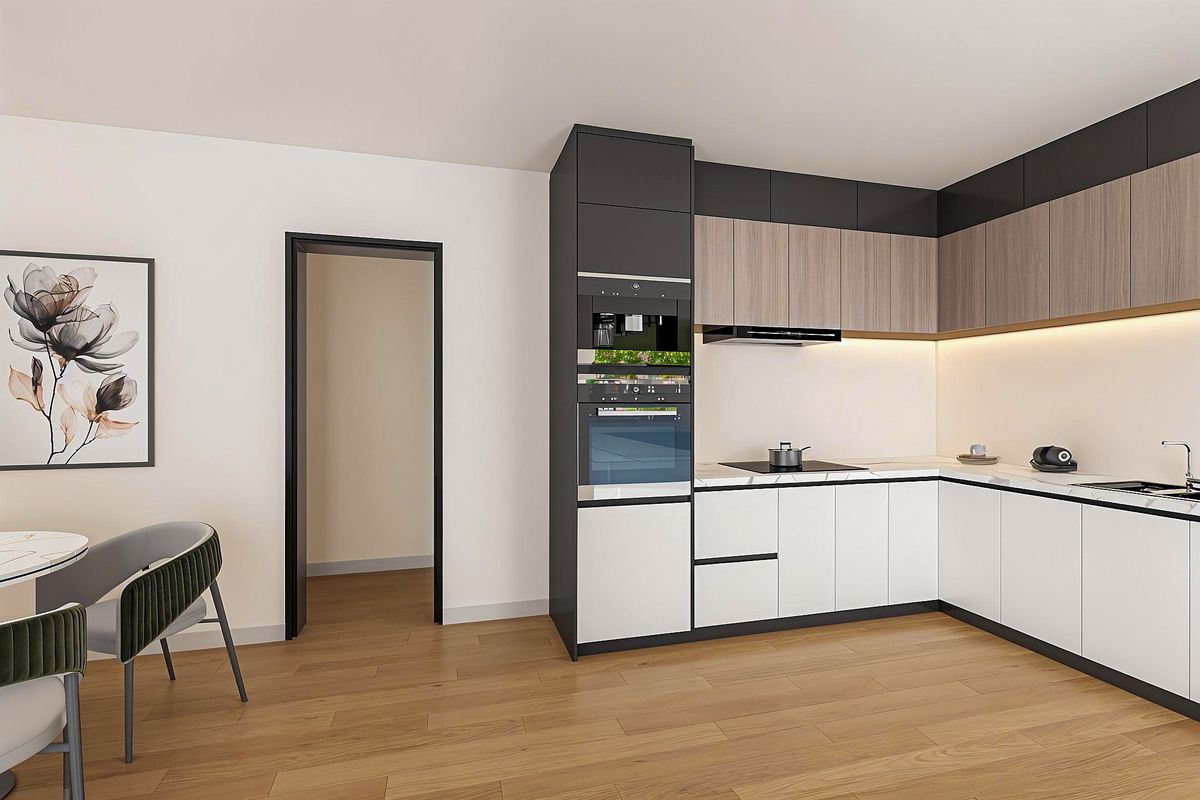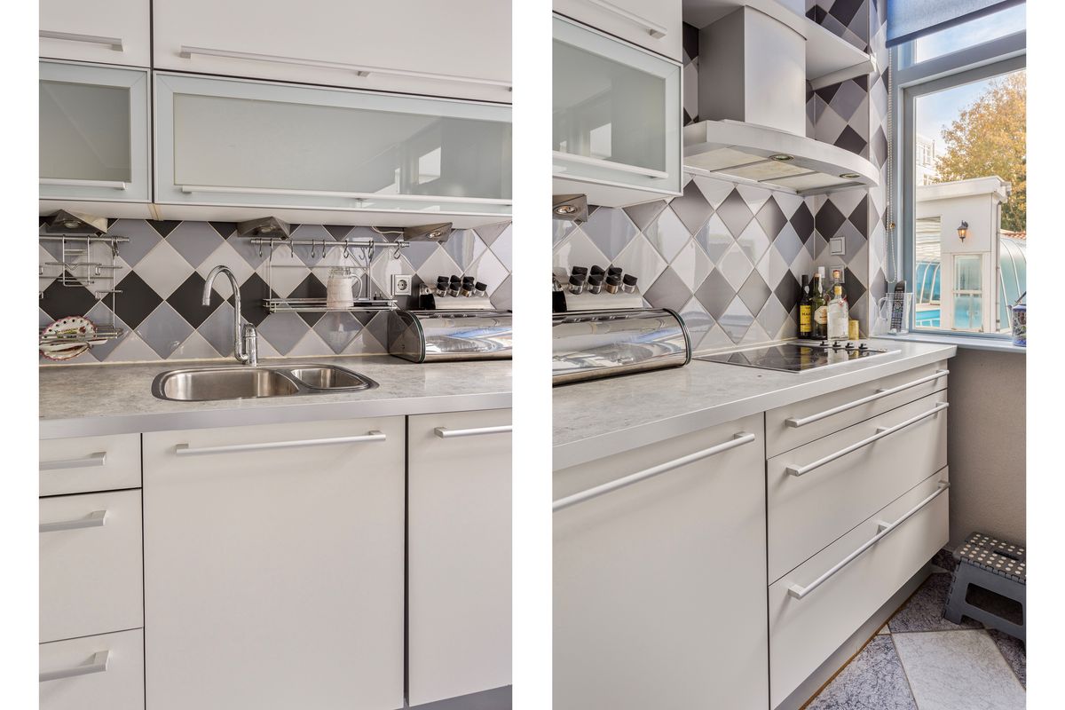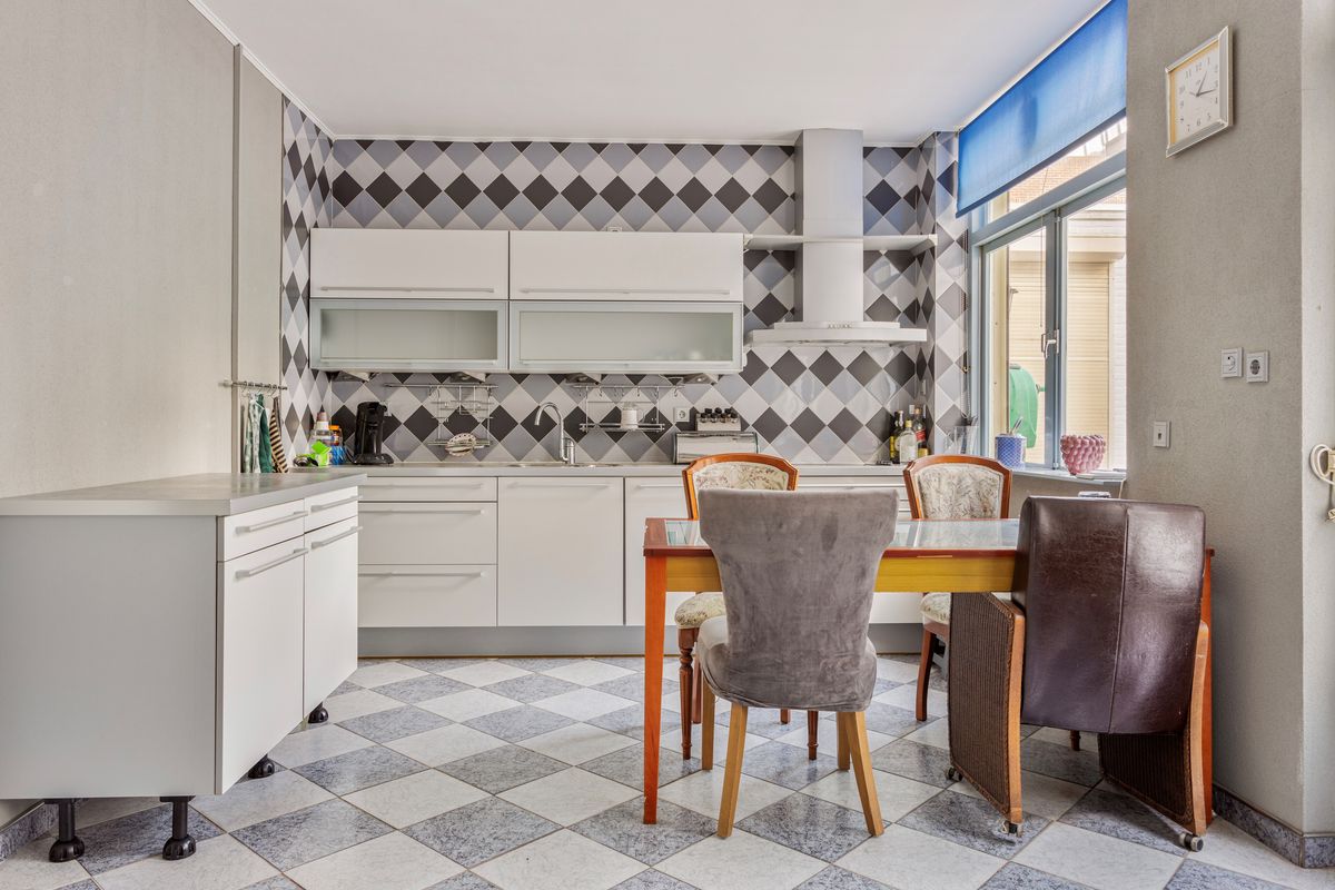 U komt de woning aan de rechterzijde binnen in een ruim entree. Aan de rechterzijde bevindt zich het toilet met daarnaast de ingang tot de eerste badkamer. Deze betegelde badkamer bevat een badmeubel en een douchecabine. Terug de gang in krijgt u aan de rechterzijde de enorme leefkeuken. De in wit uitgevoerde keuken is van alle gemakken voorzien en de betegelde vloer maakt de ruimte knus. De keuken geeft ook al een kijkje op het enorme binnenterrein, maar daarover later meer.