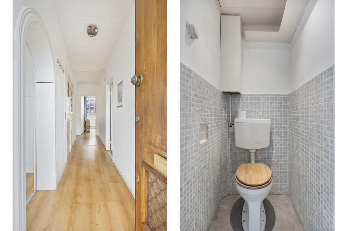 * Woningentree met de hal; meterkast en toiletruimte met duoblok en voor de helft betegeld.