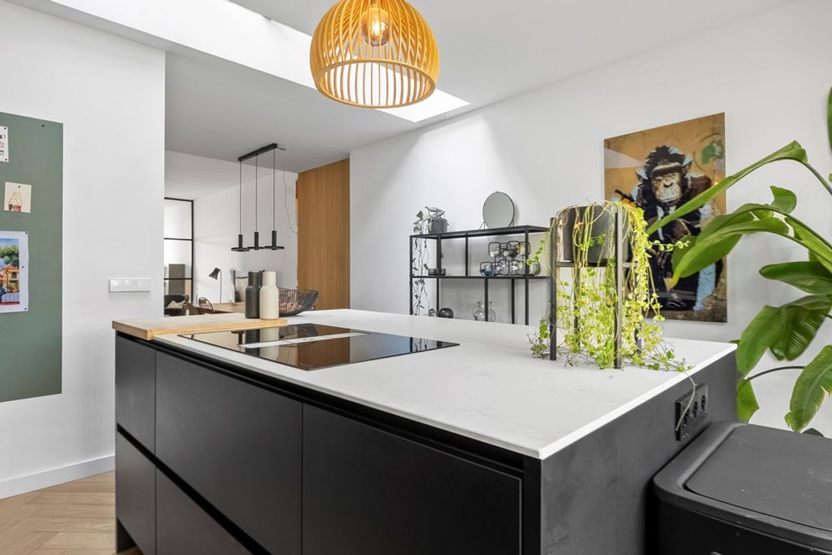 De sfeervolle woonkamer is afgewerkt met een elegante visgraat houten vloer en volledig voorzien van vloerverwarming. Dankzij de grote ramen en uitbouw aan de achterzijde is de ruimte uitnodigend. De elegante en luxe open keuken is een echte eyecatcher, voorzien van kookeiland, hoogwaardige inbouwapparatuur en Selsiuz heet waterkraan – een perfecte plek voor koken én gezellig samenzijn.