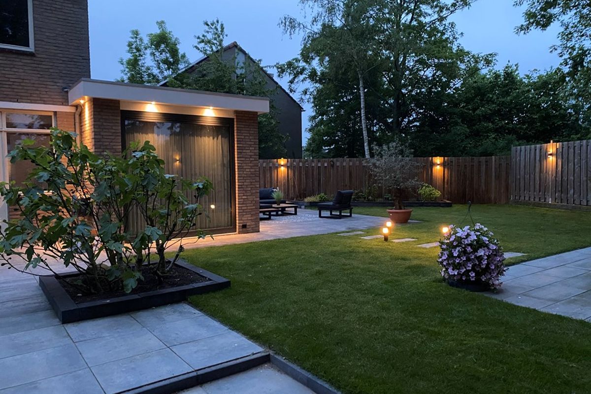 Een lichte hal met luxe toilet en trap naar de eerste etage, geeft toegang tot de ruime woonkamer met grote raampartijen. De luxe woonkeuken met een ruim eiland heeft verschillende inbouwapparatuur en een deur met toegang tot de tuin. Daarnaast is er een zeer grote aanbouw die nu ingericht is als relax/werk tv ruimte. De aanbouw heeft luxe schuifbare harmonica deuren met wederom uitzicht en toegang tot de ruime tuin met veel privacy. De tuin heeft verschillende terrassen en veel privacy. De gehele begane grond is voorzien van vloerverwarming.