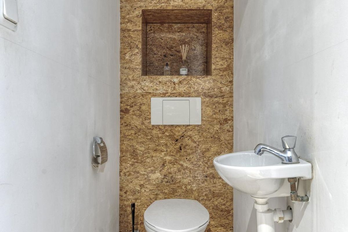 - Toilet: Het toilet is praktisch ingedeeld en voorzien van een zwevend closet met fonteintje. De vloer en achterwand zijn afgewerkt met houtlook panelen, wat zorgt voor een warme en moderne uitstraling.