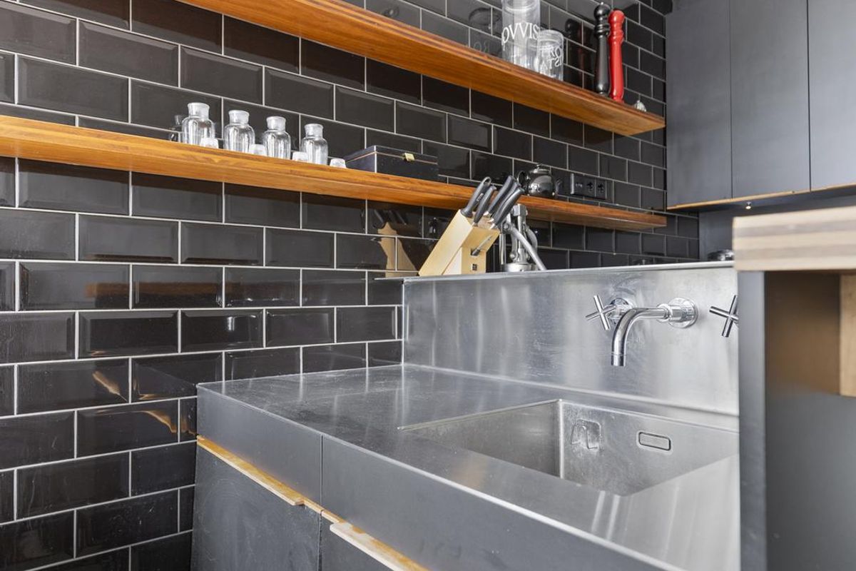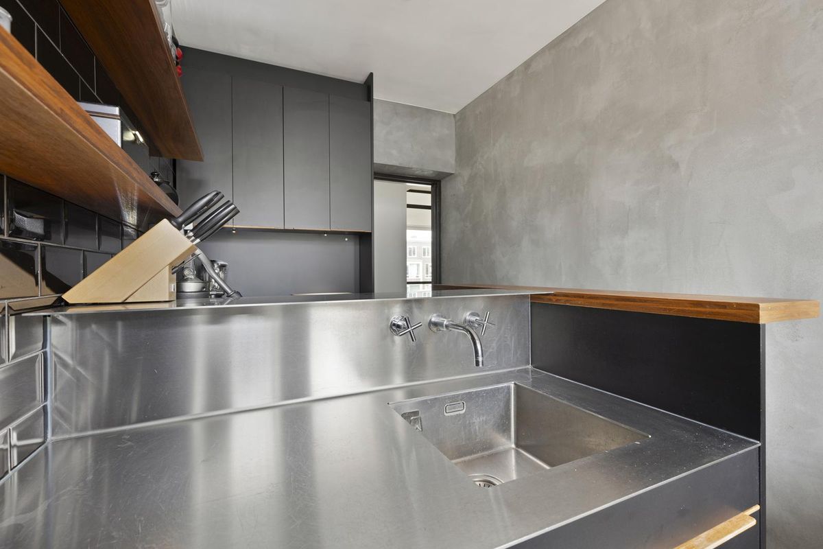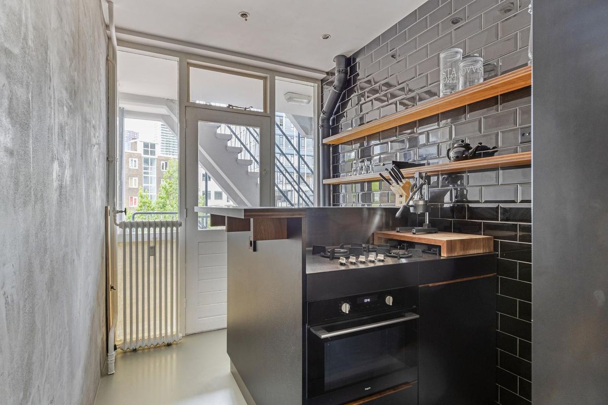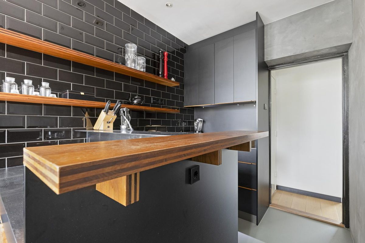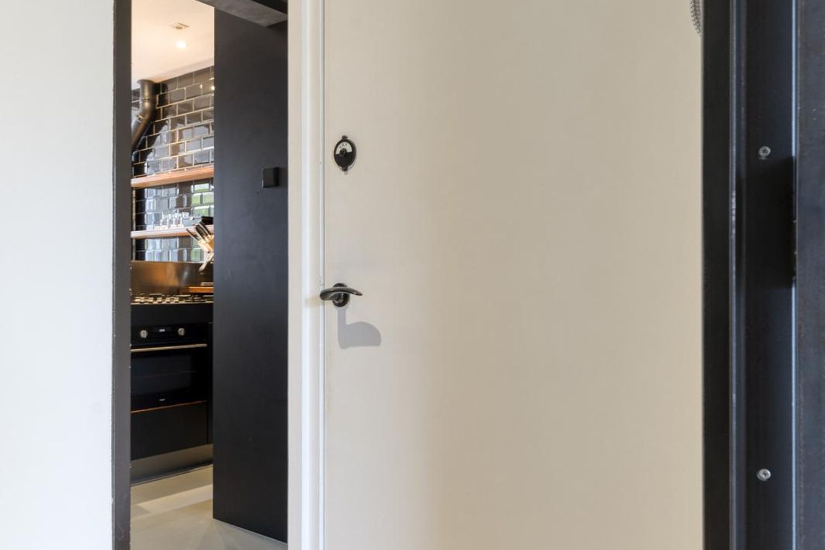 - Keuken: De moderne keuken is uitgevoerd in een strak design met donkere fronten, een rvs-werkblad en een sfeervolle tegelwand. Dankzij de praktische indeling met kookplaat, oven en veel kastruimte is de keuken niet alleen stijlvol, maar ook zeer functioneel. De deur in de keuken geeft direct toegang tot het trappenhuis van het gebouw en vormt zo een praktische tweede uitgang van de woning.