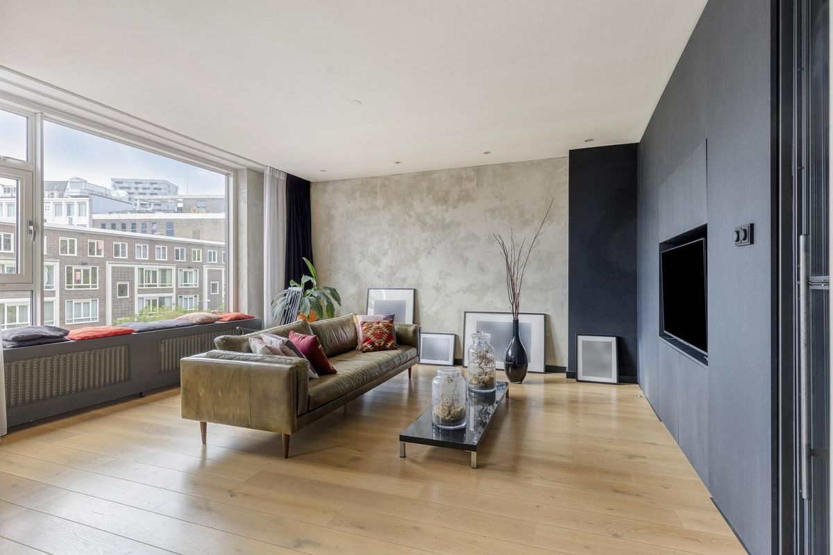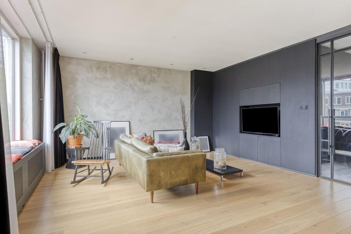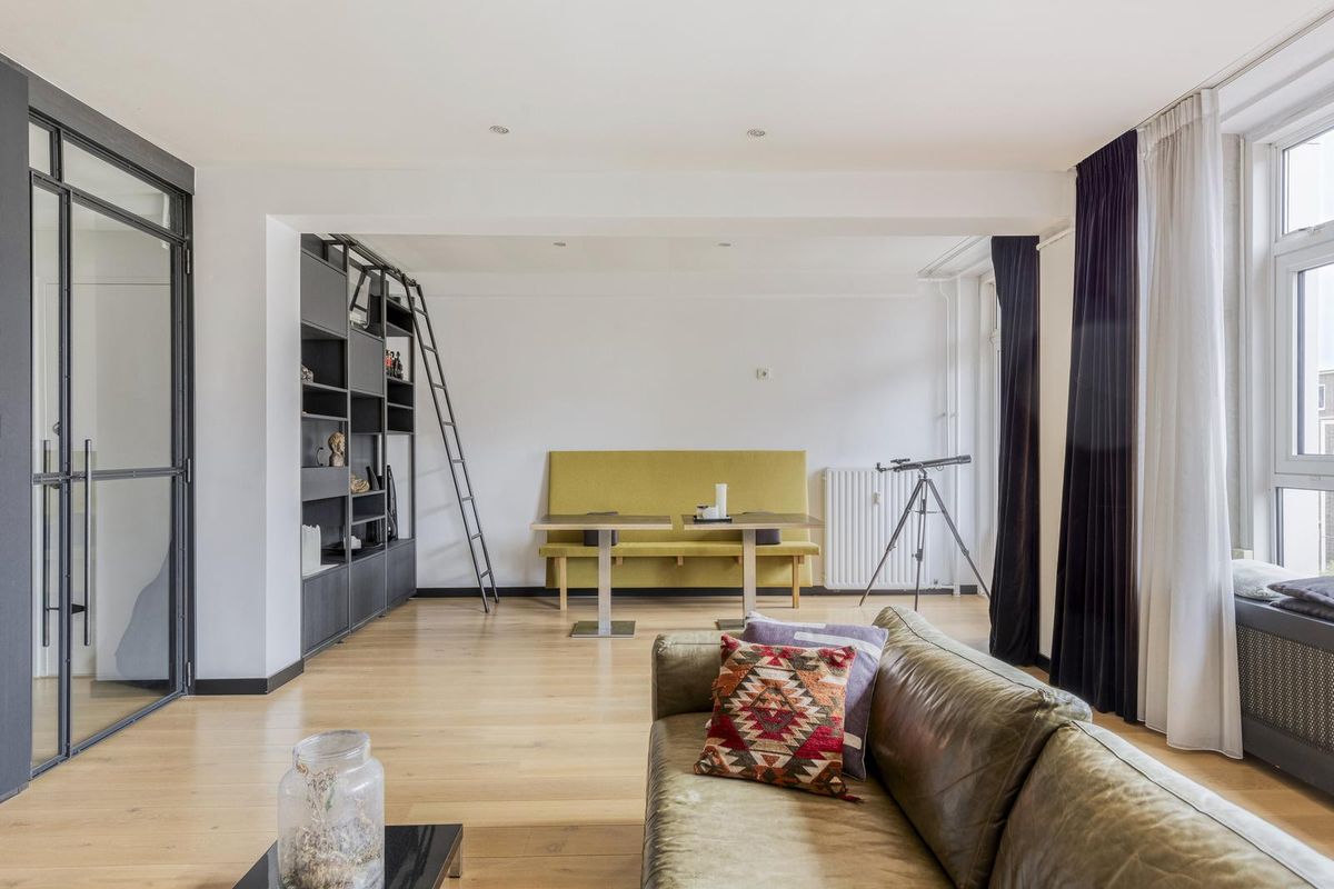 - Woonkamer: De ruime woonkamer is modern afgewerkt met een houten vloer en grote raampartijen die veel licht binnenlaten. Het strakke interieur en de royale indeling zorgen voor een open, stijlvolle uitstraling. Vanuit de woonkamer is er toegang tot het balkon aan de voorzijde met uitzicht op de levendige straat.