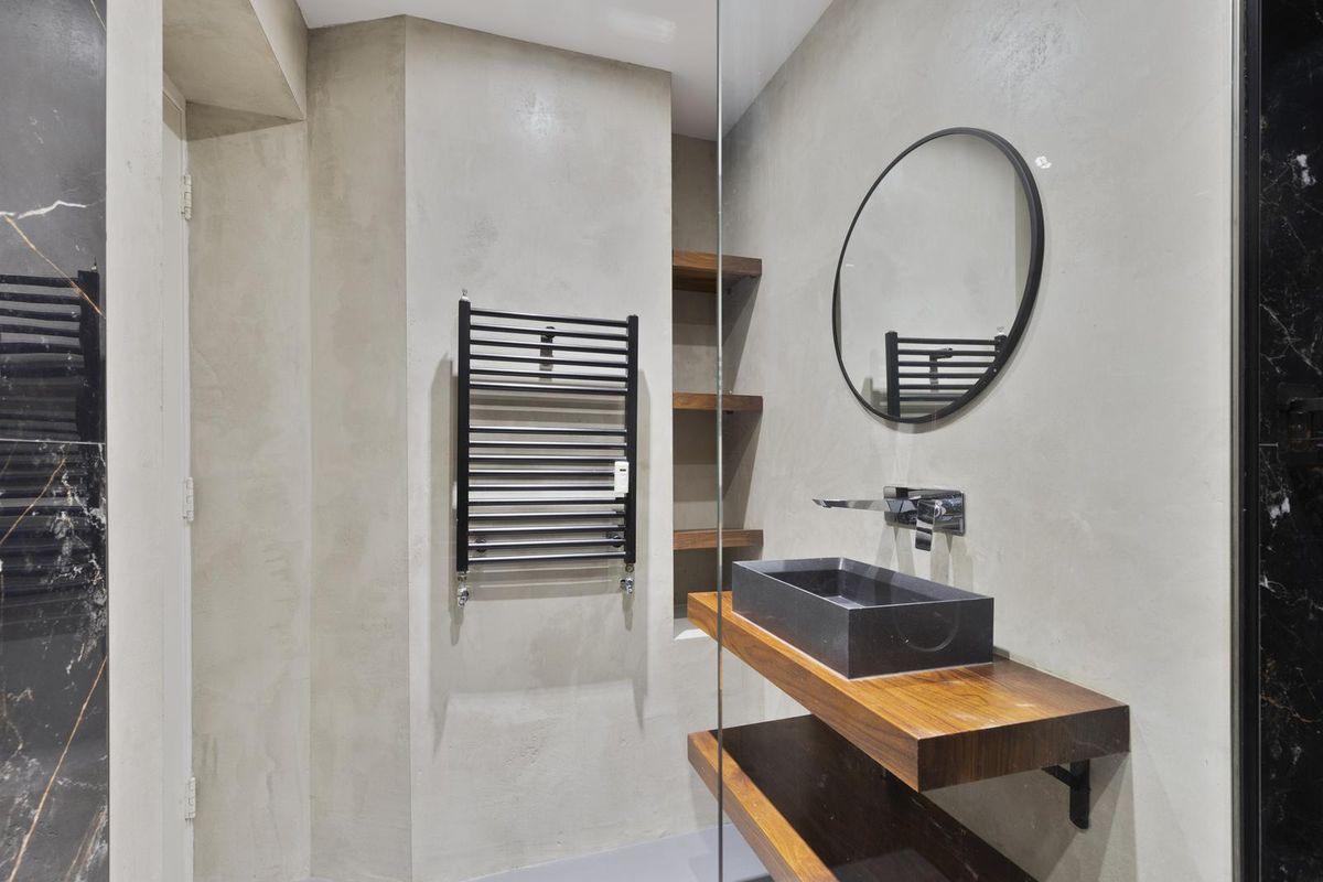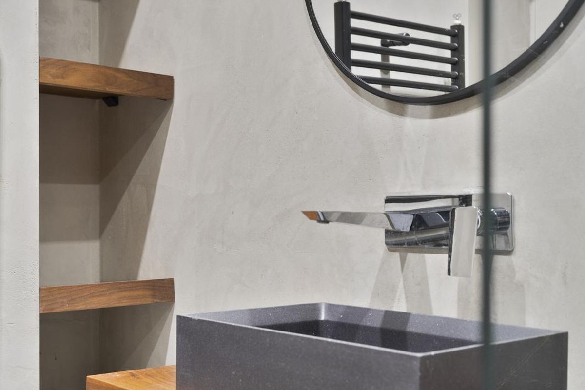 - Badkamer: De badkamer is modern en luxe uitgevoerd met een ruime inloopdouche en een stijlvol wastafelmeubel met houten details. De vloer is strak afgewerkt in een lichte betonlook, terwijl de wanden deels zijn voorzien van marmeren tegels en deels van glad stucwerk.