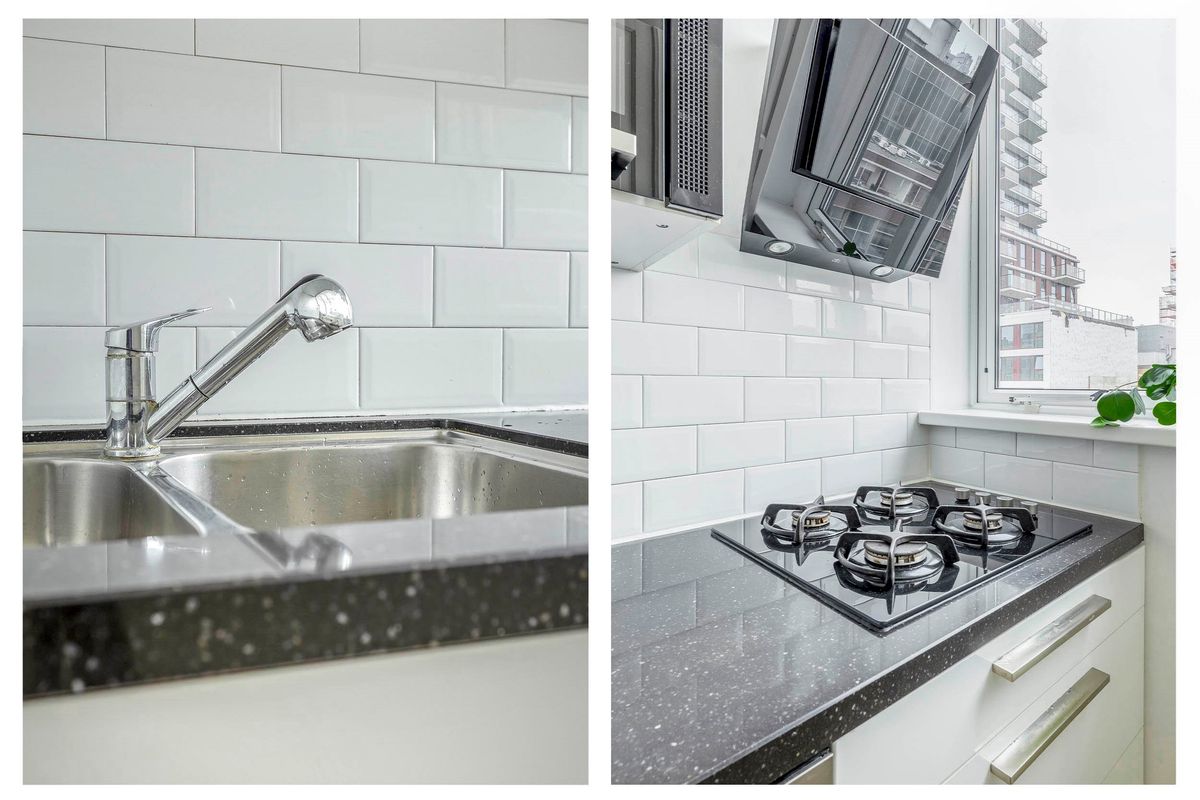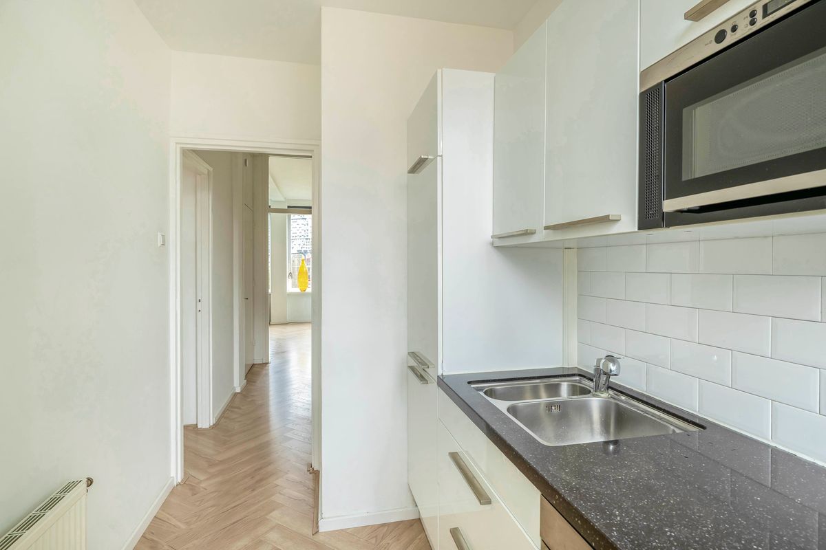 De moderne keuken bevindt zich aan de achterzijde. Deze is voorzien van een 4-pits gaskookplaat, afzuigkap, combioven en koel-vriescombinatie. De keuken is in witte kleurstelling met hoogglans keukenkasten. Het natuurstenen aanrechtblad zorgt voor een strak geheel. De witte metrotegels als achterwand maakt het geheel af.