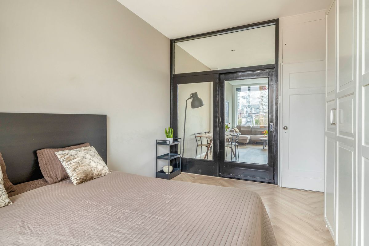 Aan de rustige achterzijde bevindt zich de grote slaapkamer. De slaapkamer is van de woonkamer gescheiden middels schuifdeur met veel glas en mooie zwarte kozijnen. Door het vele glas is er vanuit de achterzijde en voorzijde natuurlijk licht. De kamer is voorzien van een grote kastenwand en een inbouwkast met de aansluitingen van de wasmachine.