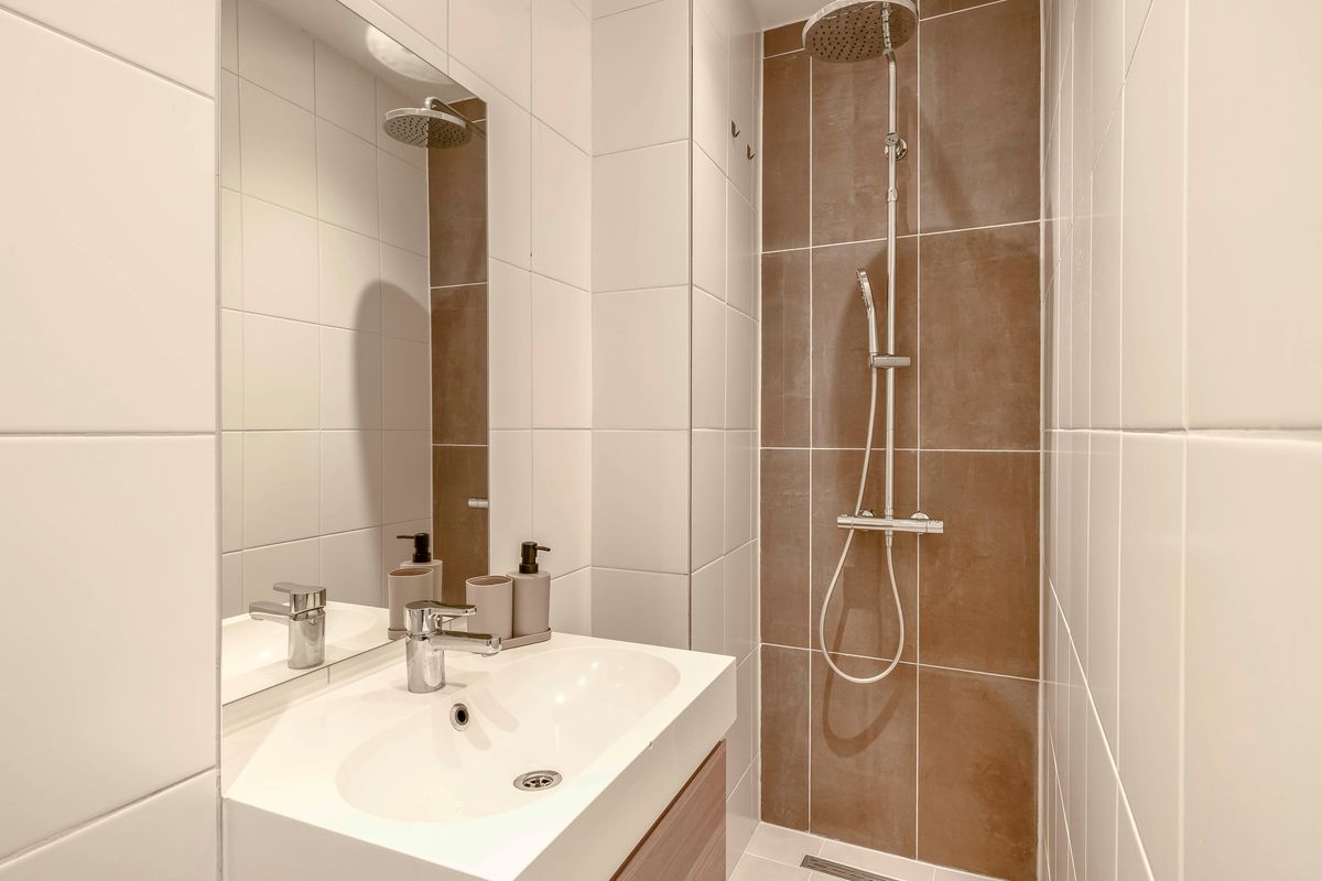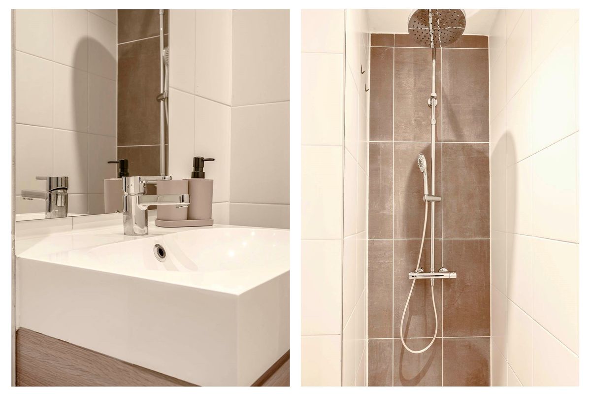 De mooie badkamer is volledig betegeld in witte en bruine tegels en heeft een inloopdouche, wastafelmeubel en toilet.