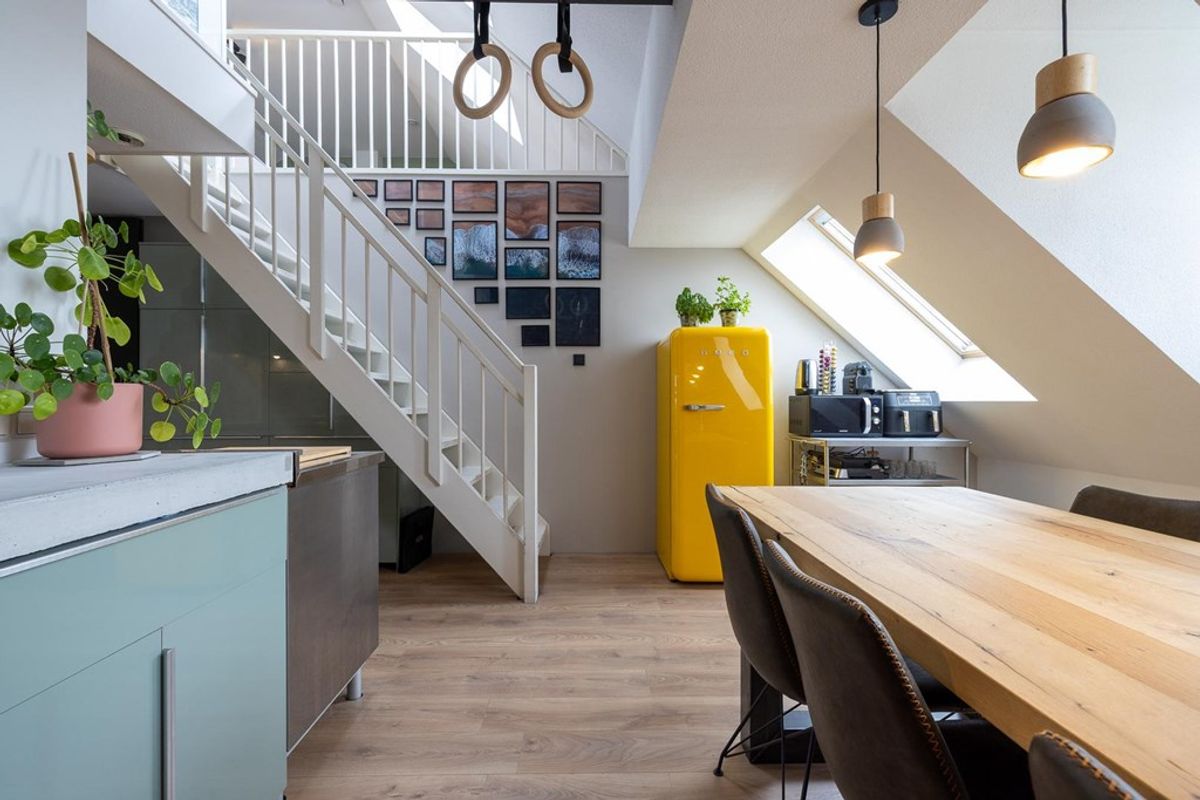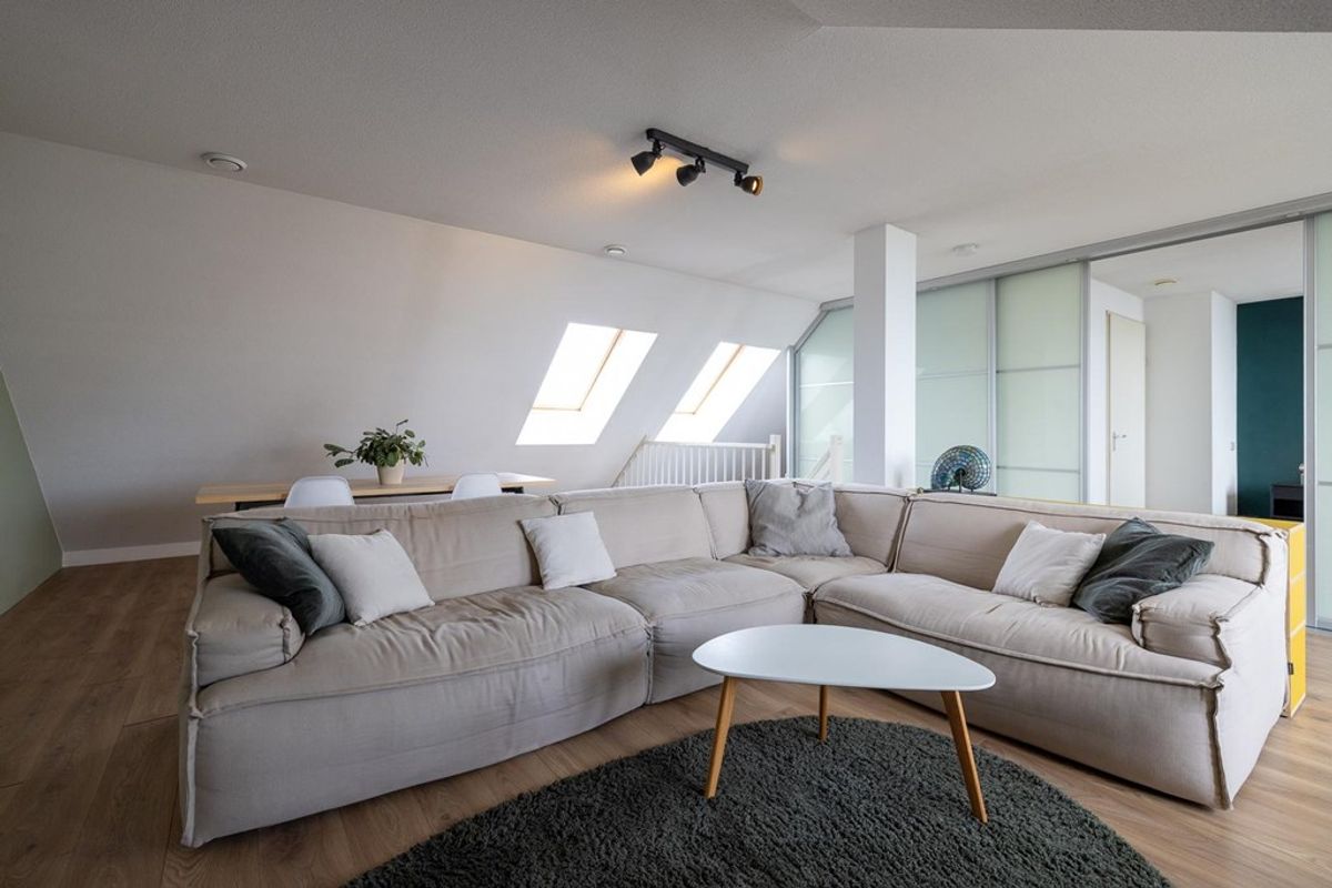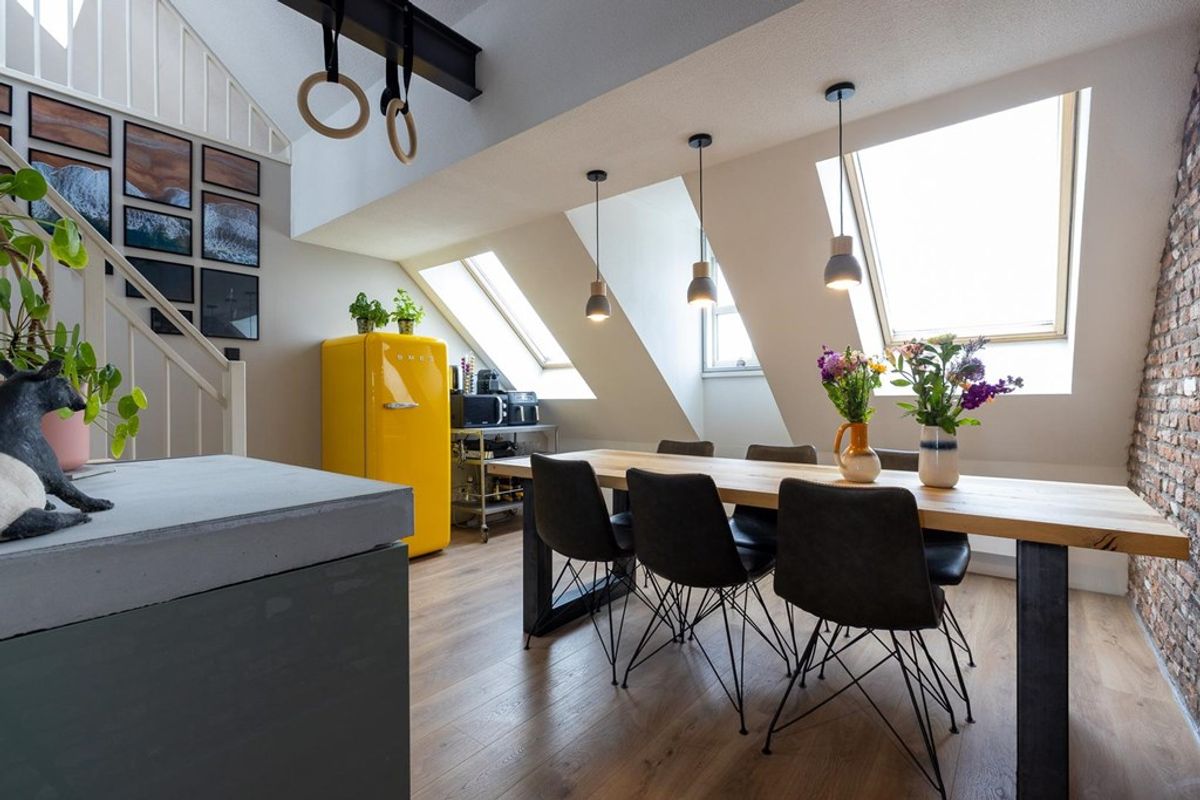 Een vaste trap leidt naar de woonverdieping onder de karakteristieke kap. Hier is een lichte woonkamer met grote dakvensters en een prettige lichtinval. De hoofdslaapkamer grenst aan de moderne badkamer, die in 2020 volledig is vernieuwd.