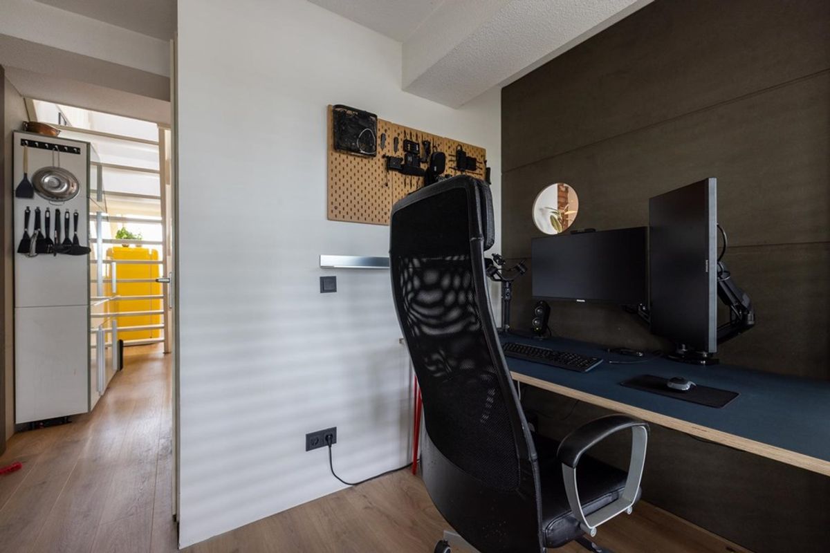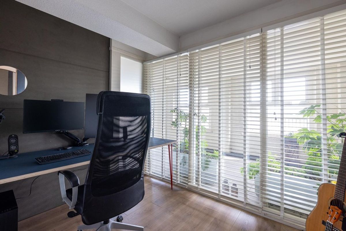 Entree met gang en twee vaste kasten, waarvan één met wasmachineaansluiting. De moderne woonkeuken is voorzien van diverse inbouwapparatuur en biedt ruimte voor een grote eettafel. Vanuit de keuken is het toilet bereikbaar, evenals de werkkamer die ook als tweede slaapkamer kan dienen. Deze ruimte ligt heerlijk rustig aan de achterzijde van het gebouw.