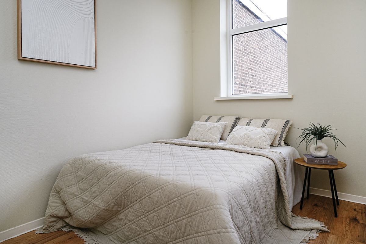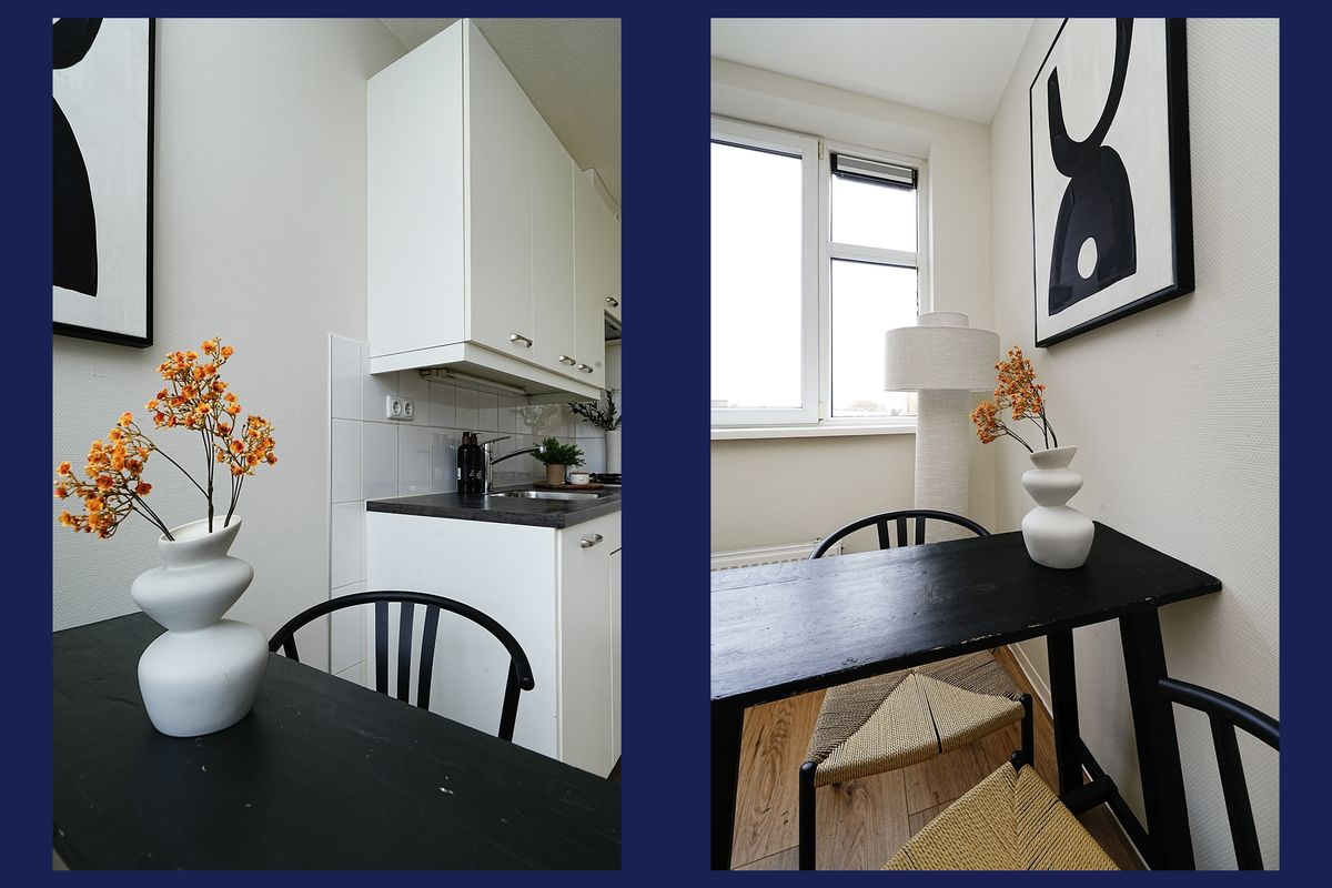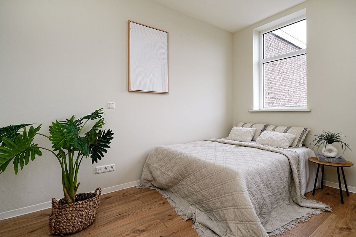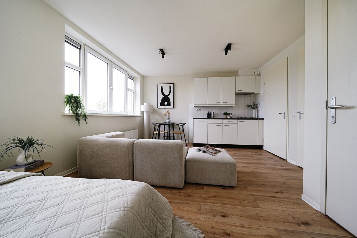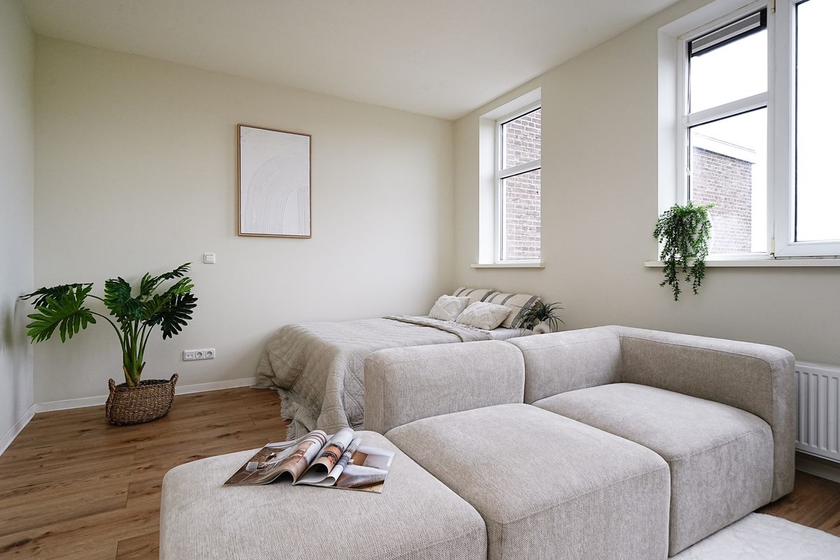 Door de grote raampartijen in kunststof kozijnen is er veel natuurlijk lichtinval en er is leuk uitzicht richting de binnentuinen aan de achterzijde. Er is een gezellige zithoek en eethoek gecreëerd. Er is ook genoeg ruimte om een tweepersoonsbed en een kast te plaatsen.
