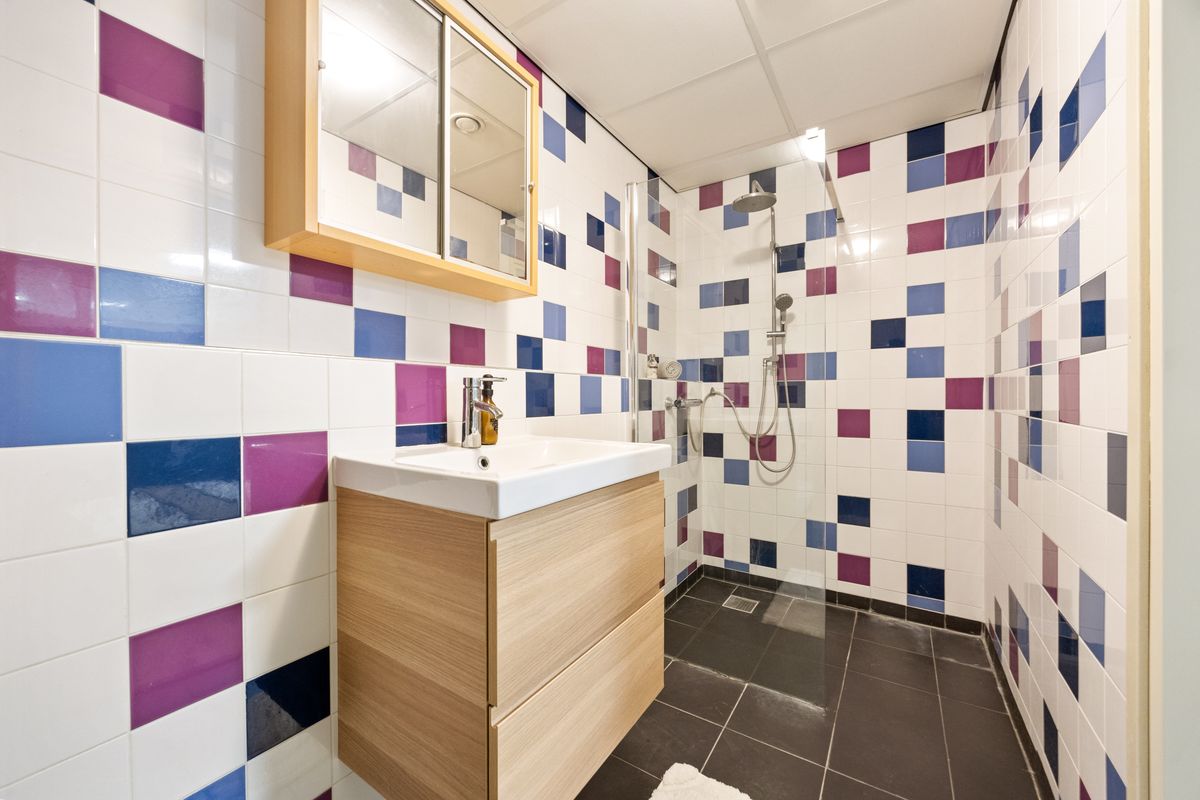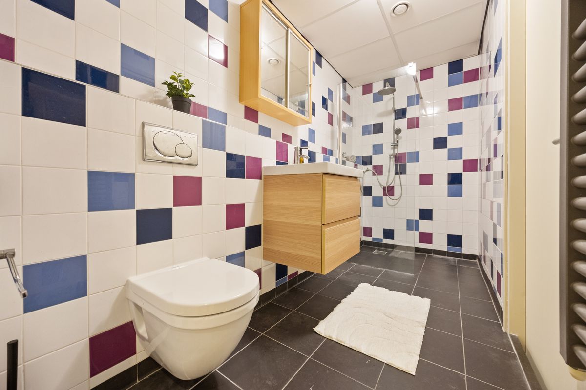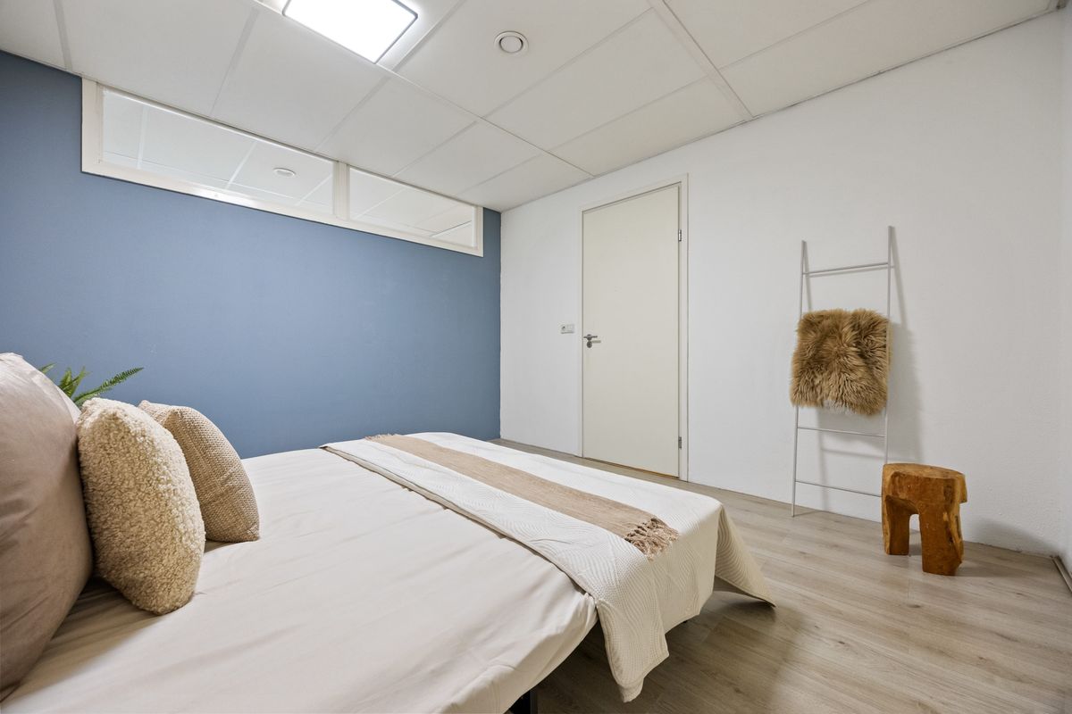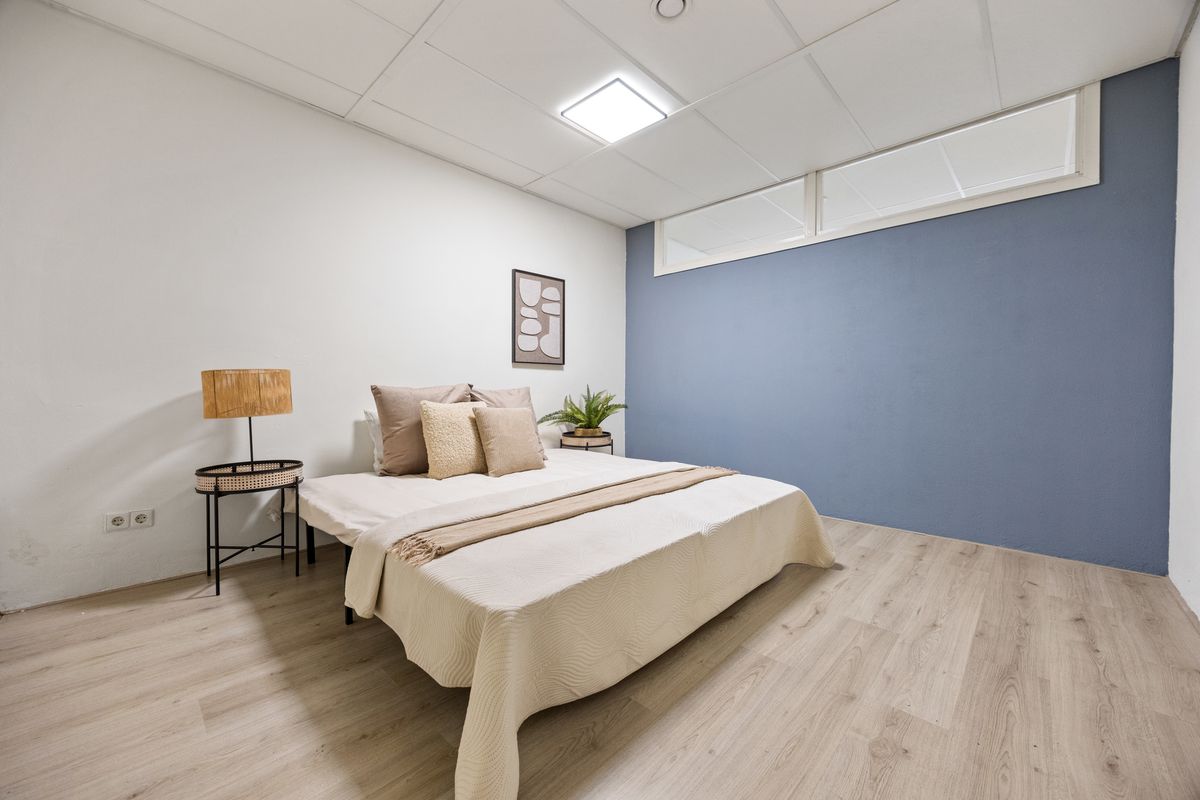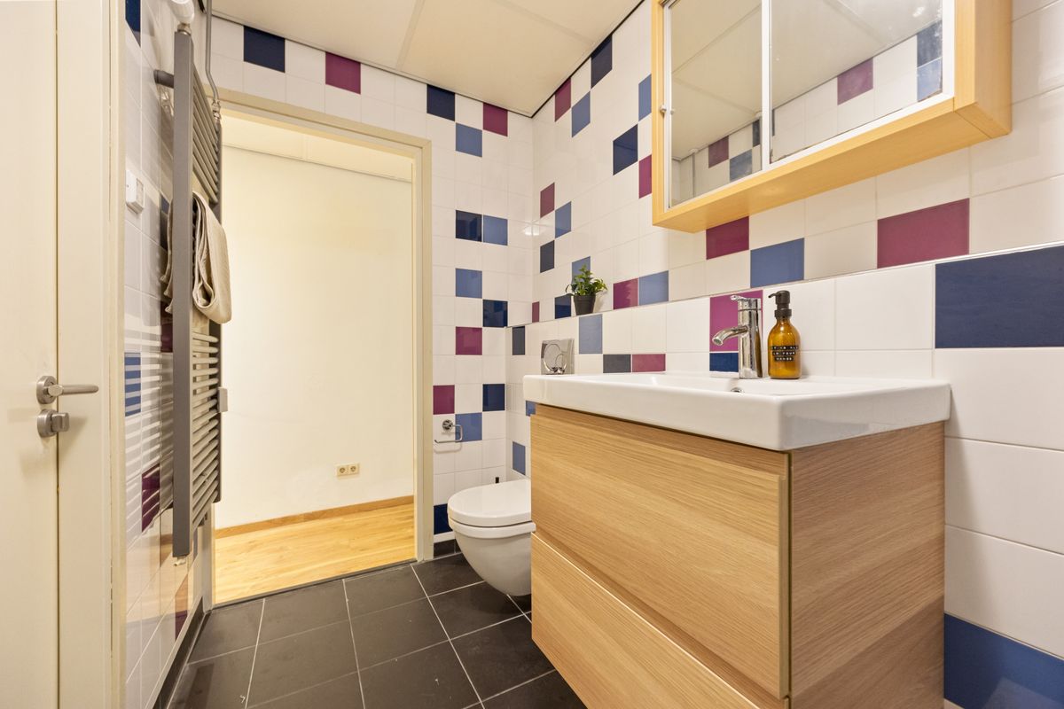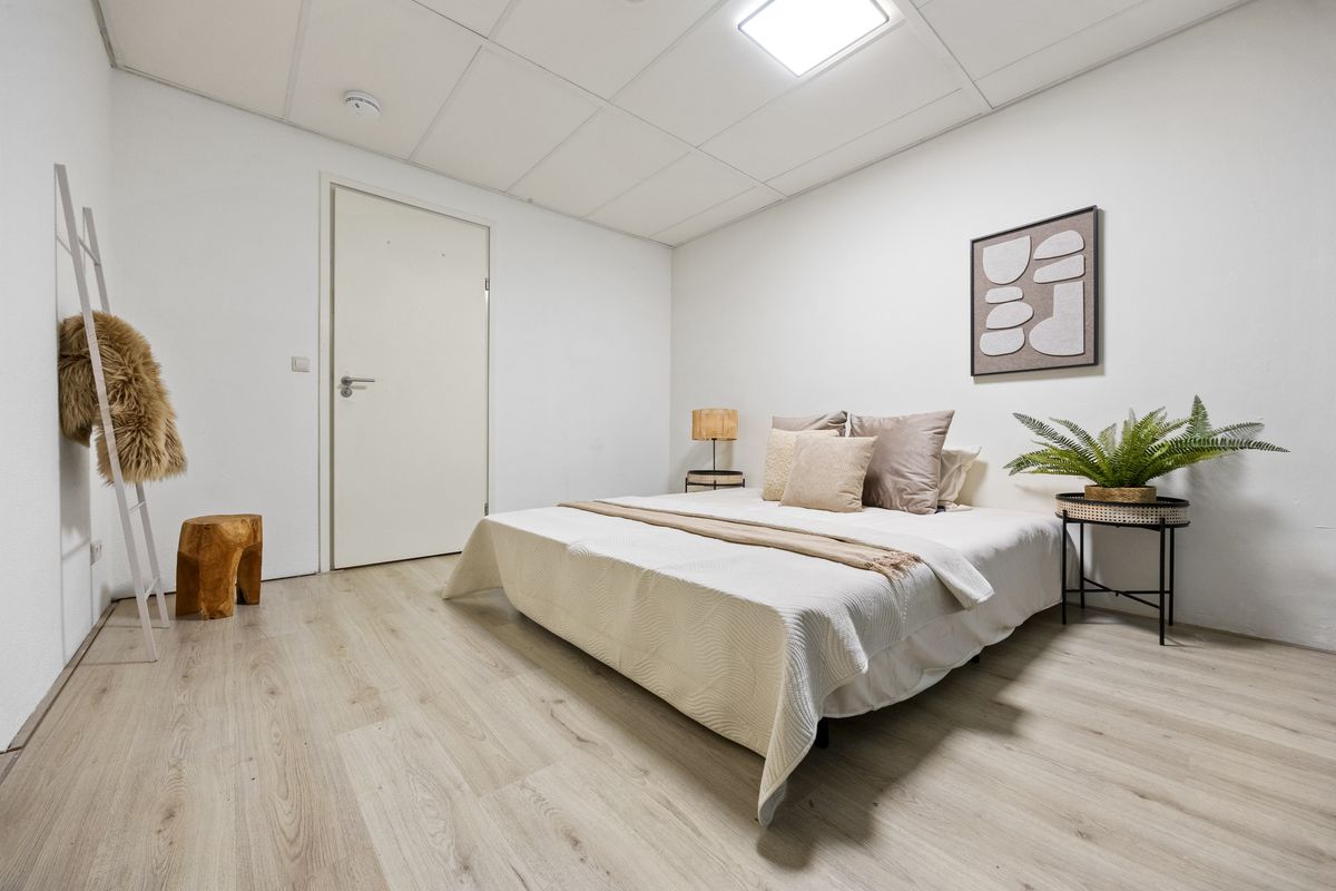 De slaapkamer is groter dan je op het eerste gezicht zou verwachten: er is ruim plek voor een tweepersoonsbed en een grote kast. Praktisch is ook de directe verbinding tussen slaapkamer en badkamer: na het opstaan loop je zo je badkamer in, wat de ochtendroutine een stuk aangenamer maakt. De badkamer is namelijk toegankelijk vanuit zowel de gang als de slaapkamer en is uitgerust met een inloopdouche, wastafel met meubel en een zwevend toilet.