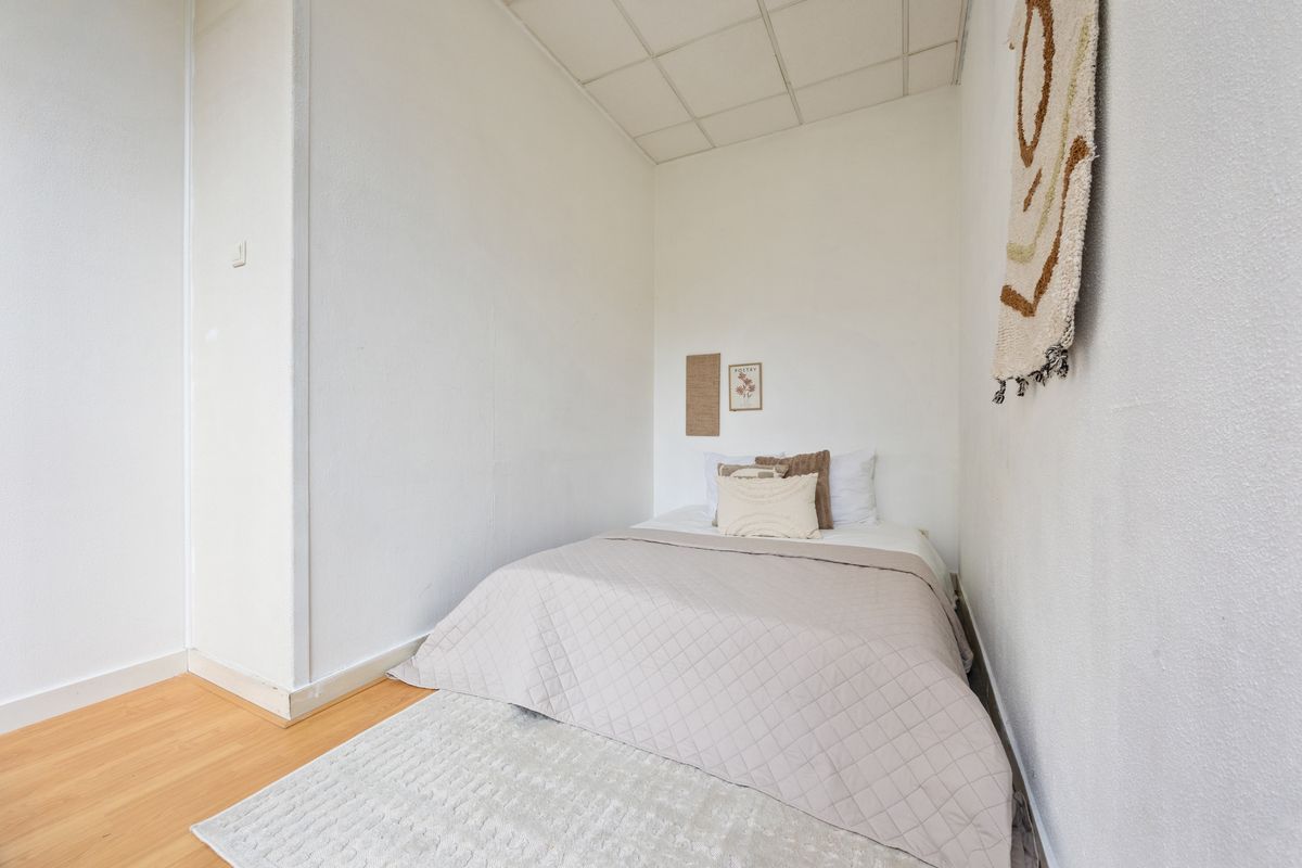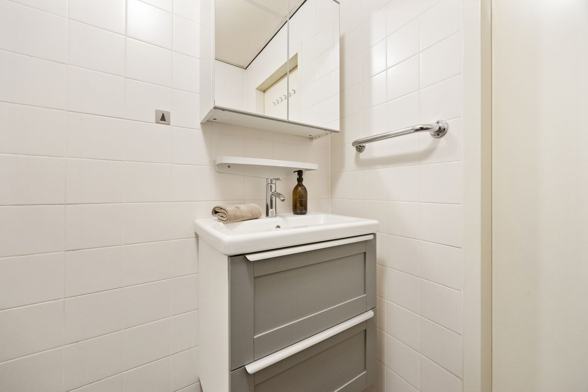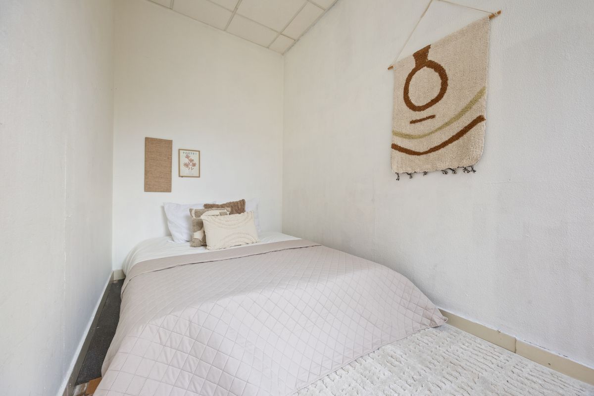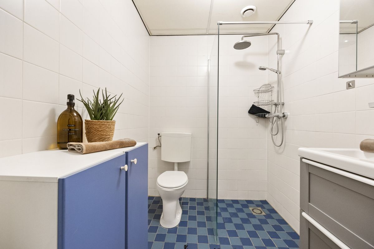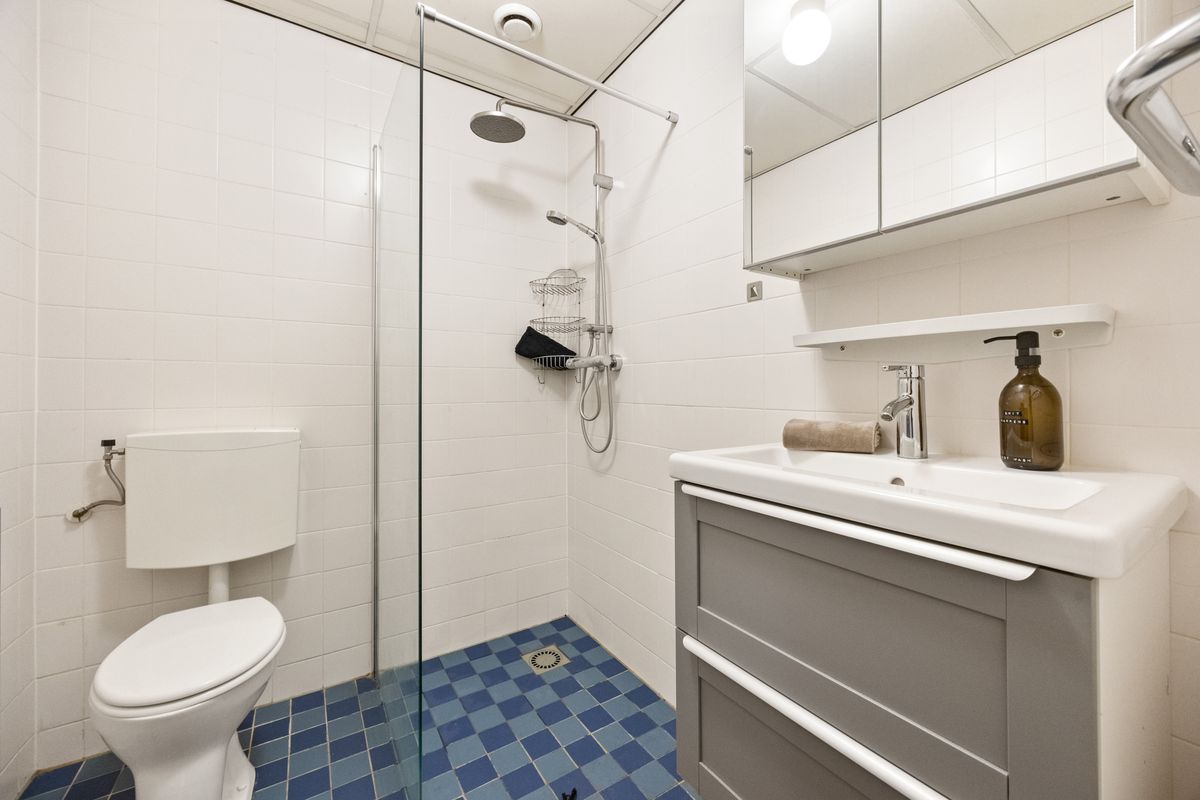 De slaapkamer is praktisch en sfeervol, met voldoende ruimte voor een tweepersoonsbed, een kledingkast en een aantal decoratieve accenten. De slaapkamer voelt knus en comfortabel aan. De badkamer is netjes en functioneel ingericht met een inloopdouche, wastafel met meubel, een spiegel, extra kastruimte en een toilet. Een fijne, frisse ruimte waar je de dag prettig begint of afsluit.