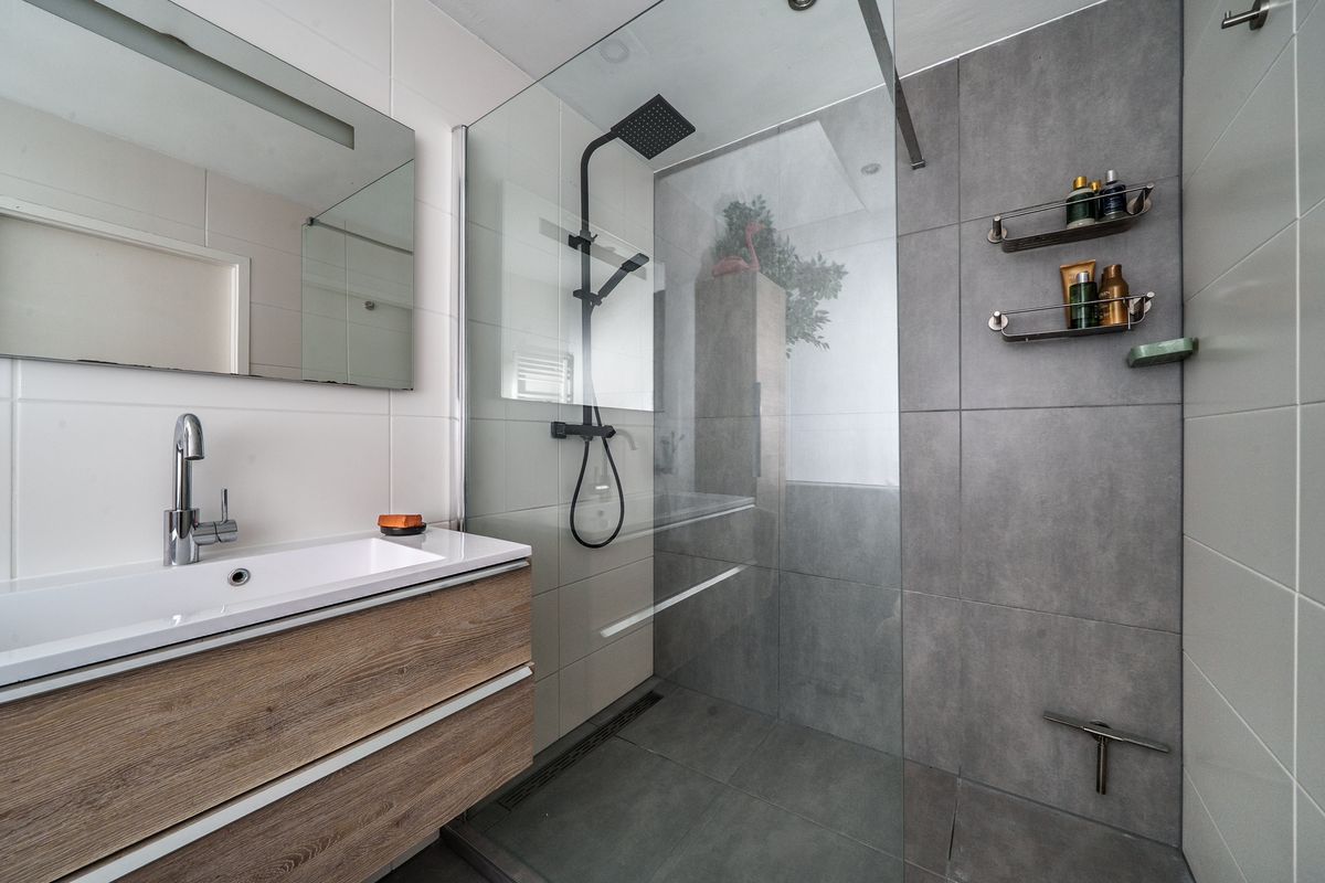 De luxe badkamer is voorzien van een grote inloopdouche met regen- en handdouche en glazen wand. Ook is er een wastafel met meubel, toilet en designradiator. Door de lichtkoepel in het dak heeft de badkamer natuurlijk daglicht.