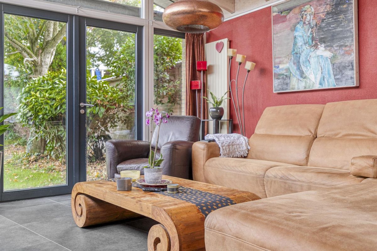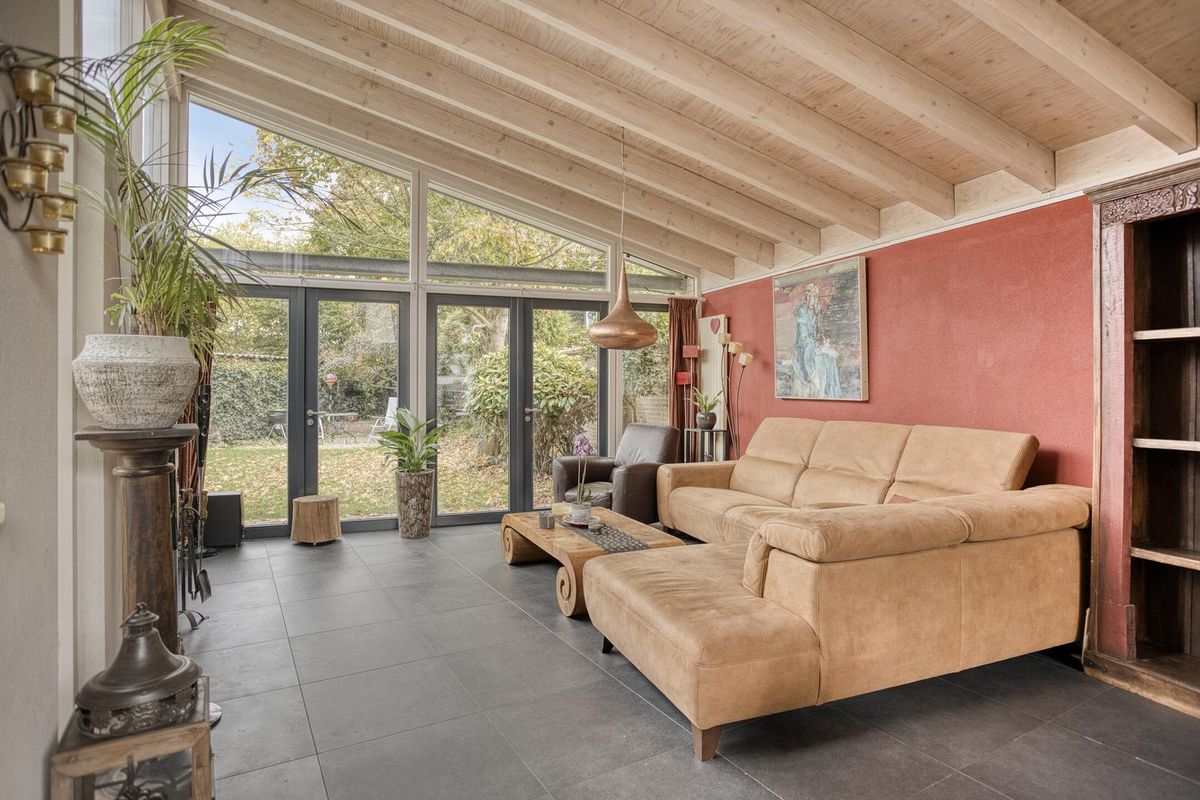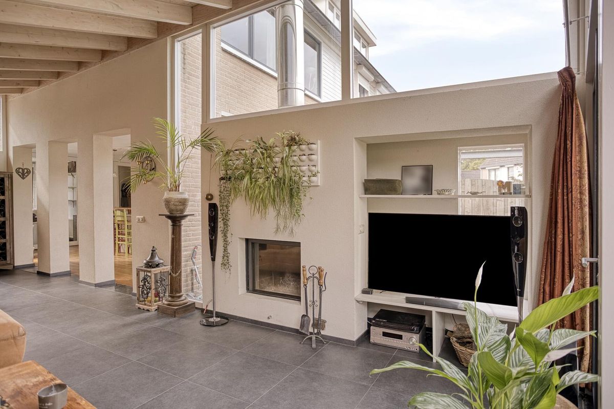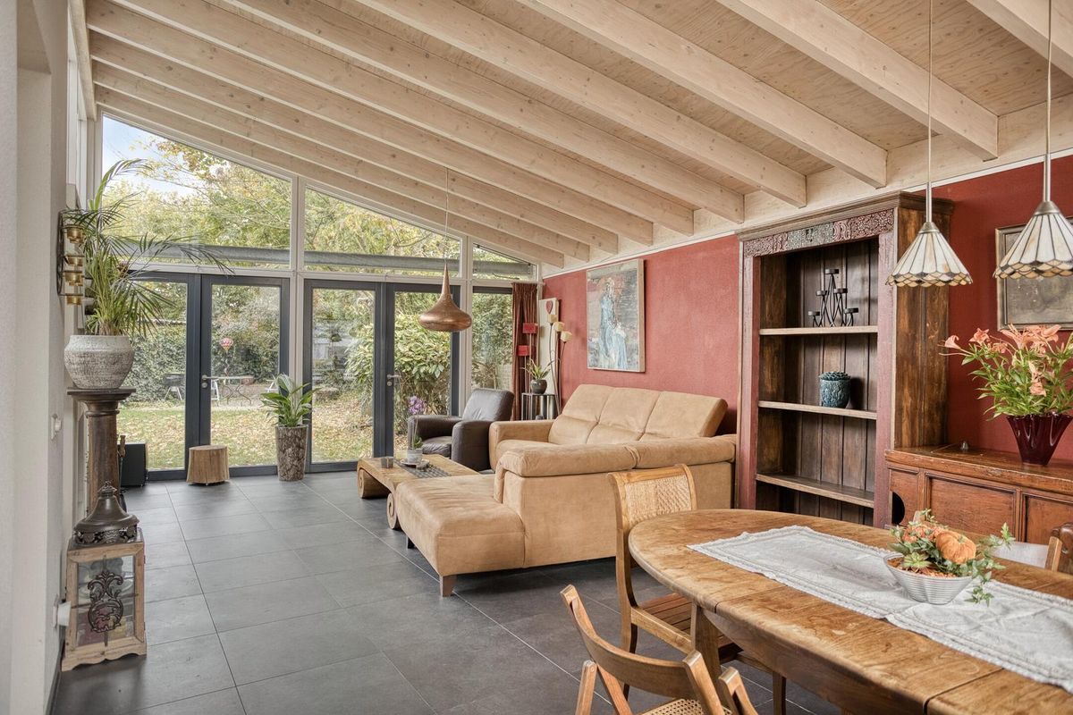 De aanbouw aan de achterzijde is een royale leefruimte waar je volop kunt genieten. Dankzij de hoge plafonds en de grote ramen stroomt het daglicht hier royaal naar binnen. De moderne Stuv-haard maakt het geheel compleet – een heerlijke plek om samen te genieten tijdens lange avonden. De woonkamer is voorzien van een praktisch ophangsysteem voor schilderijen en foto's.