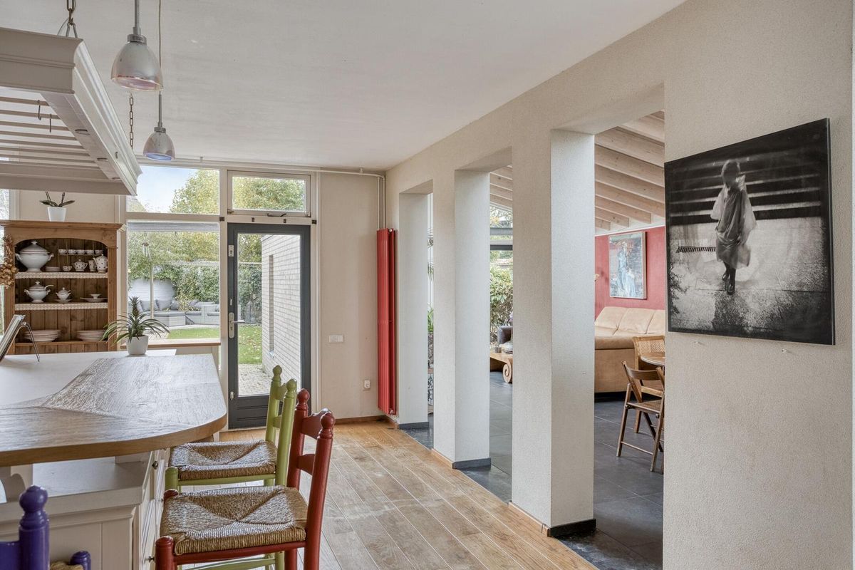 Aan de voorzijde van het huis, waar vroeger de keuken zat, bevindt zich nu een lichte ruimte die perfect dienstdoet als werkruimte of hobbykamer. Zo heb je altijd een rustige plek om te werken of te ontspannen.