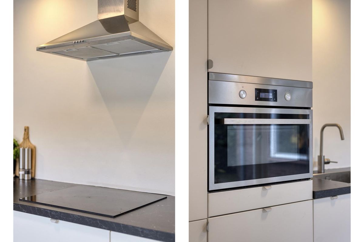 - De keuken is voorzien van een kookplaat, afzuigkap, combi-oven, koel-vriescombinatie en vaatwasser.