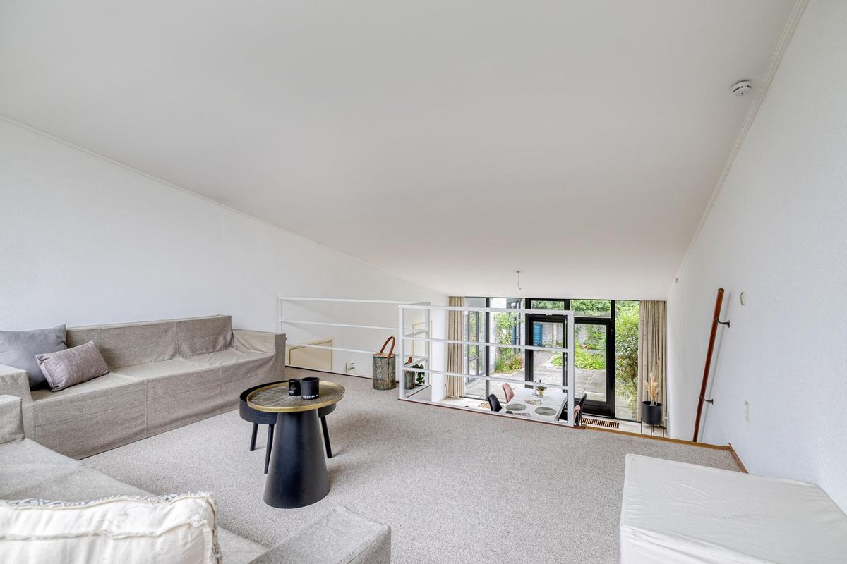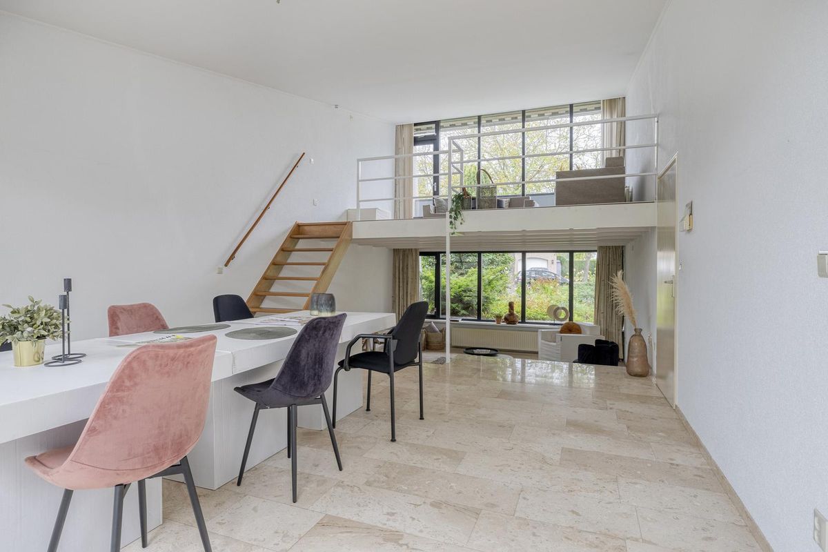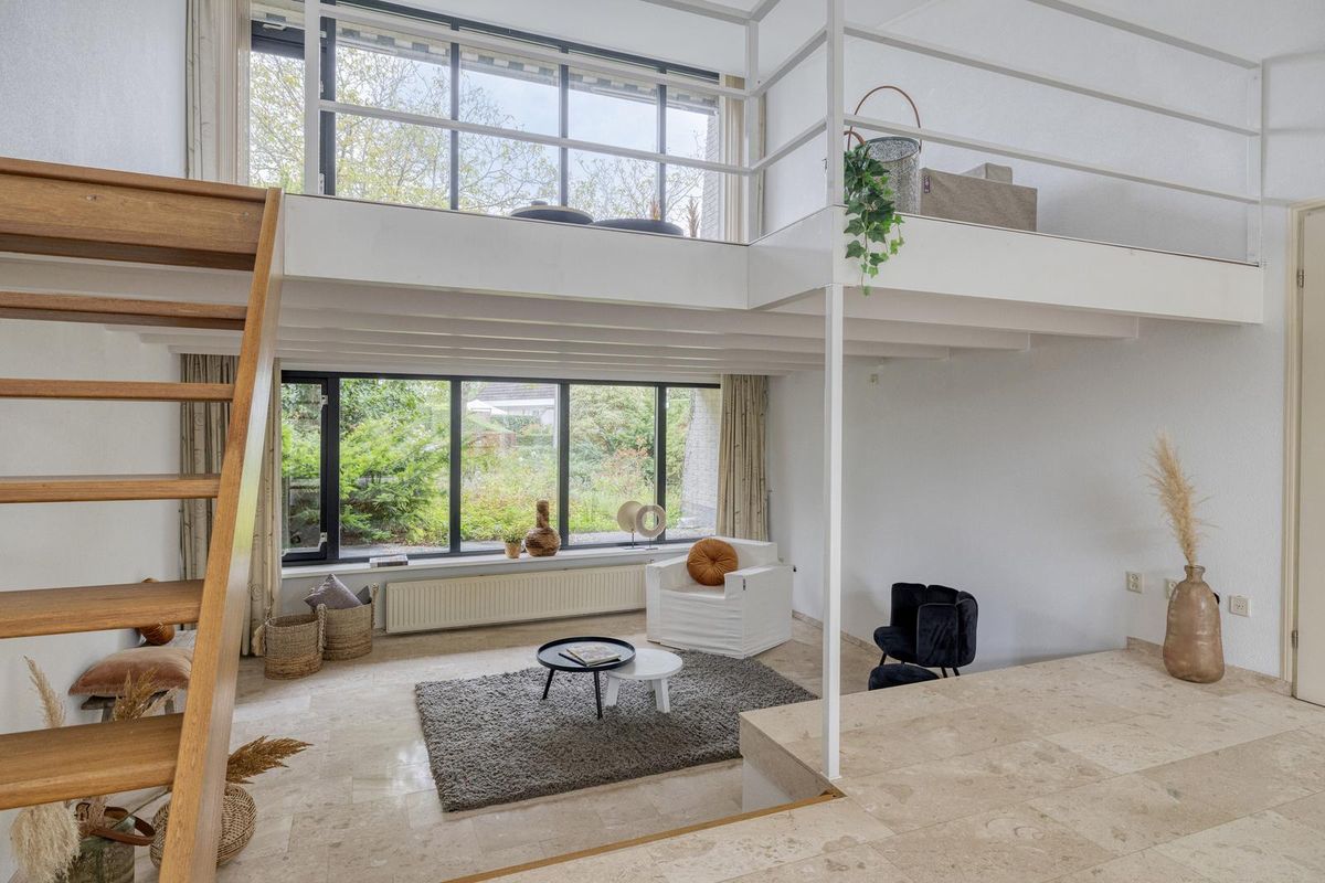 De woonkamer is sfeervol en royaal opgezet, voorzien van een natuurstenen vloer, strakke stucwanden en een stucplafond. Door de splitlevel-indeling is er een speelse verdeling tussen de woon- en zitgedeeltes: enkele treden omhoog leiden naar een gezellig zitdeel aan de voorzijde met fraai uitzicht op de omgeving, terwijl enkele treden omlaag toegang geven tot een ruime en lichte living.