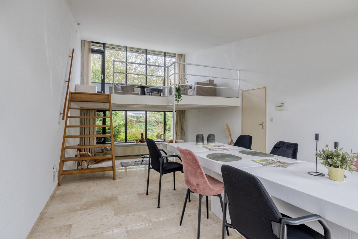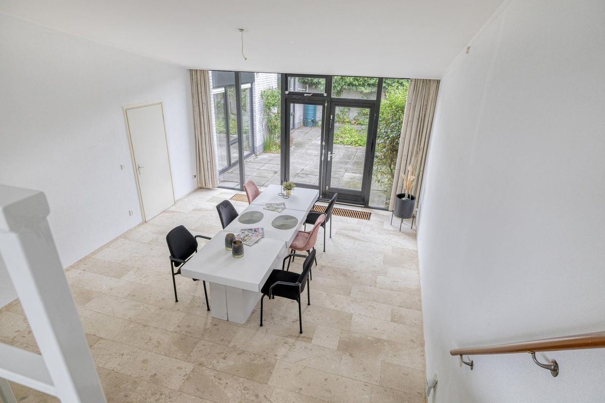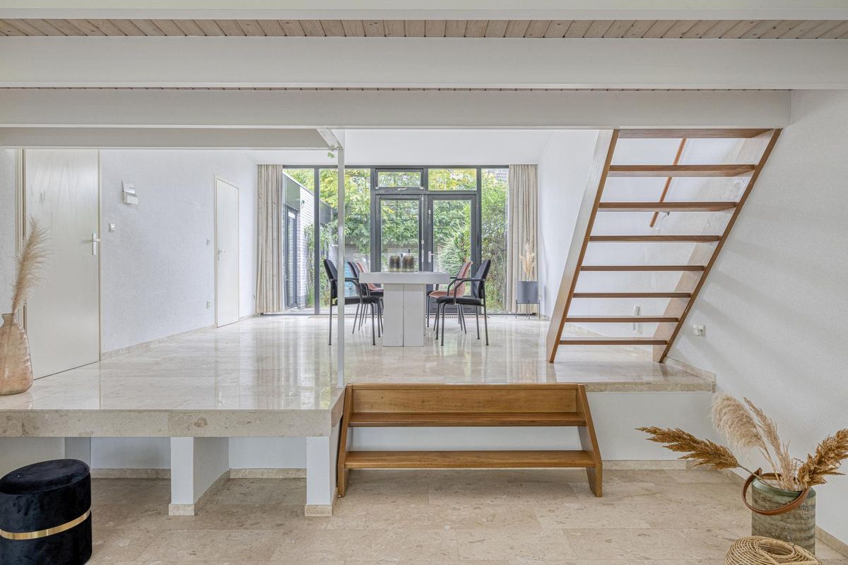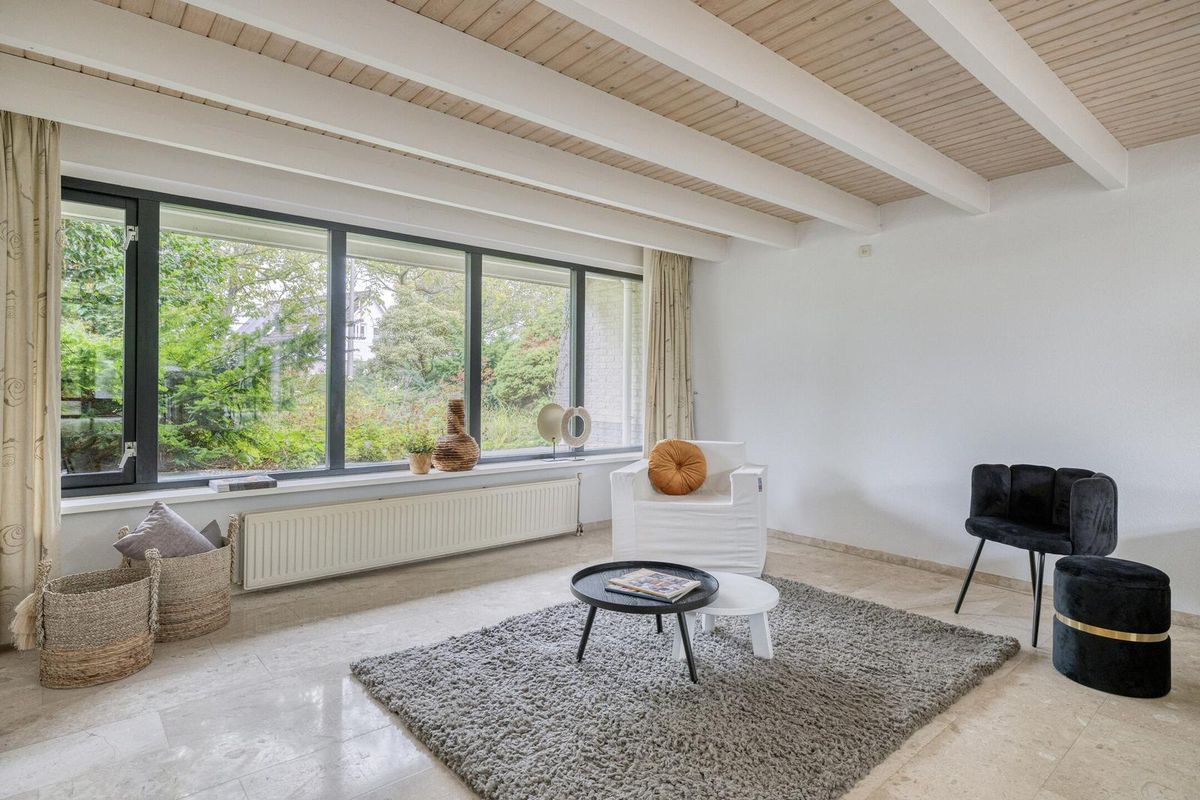 De woonkamer is sfeervol en royaal opgezet, voorzien van een natuurstenen vloer, strakke stucwanden en een stucplafond. Door de splitlevel-indeling is er een speelse verdeling tussen de woon- en zitgedeeltes: enkele treden omhoog leiden naar een gezellig zitdeel aan de voorzijde met fraai uitzicht op de omgeving, terwijl enkele treden omlaag toegang geven tot een ruime en lichte living.