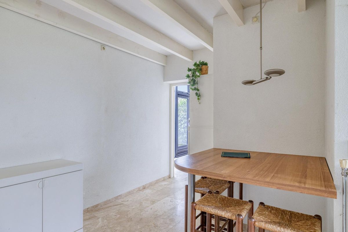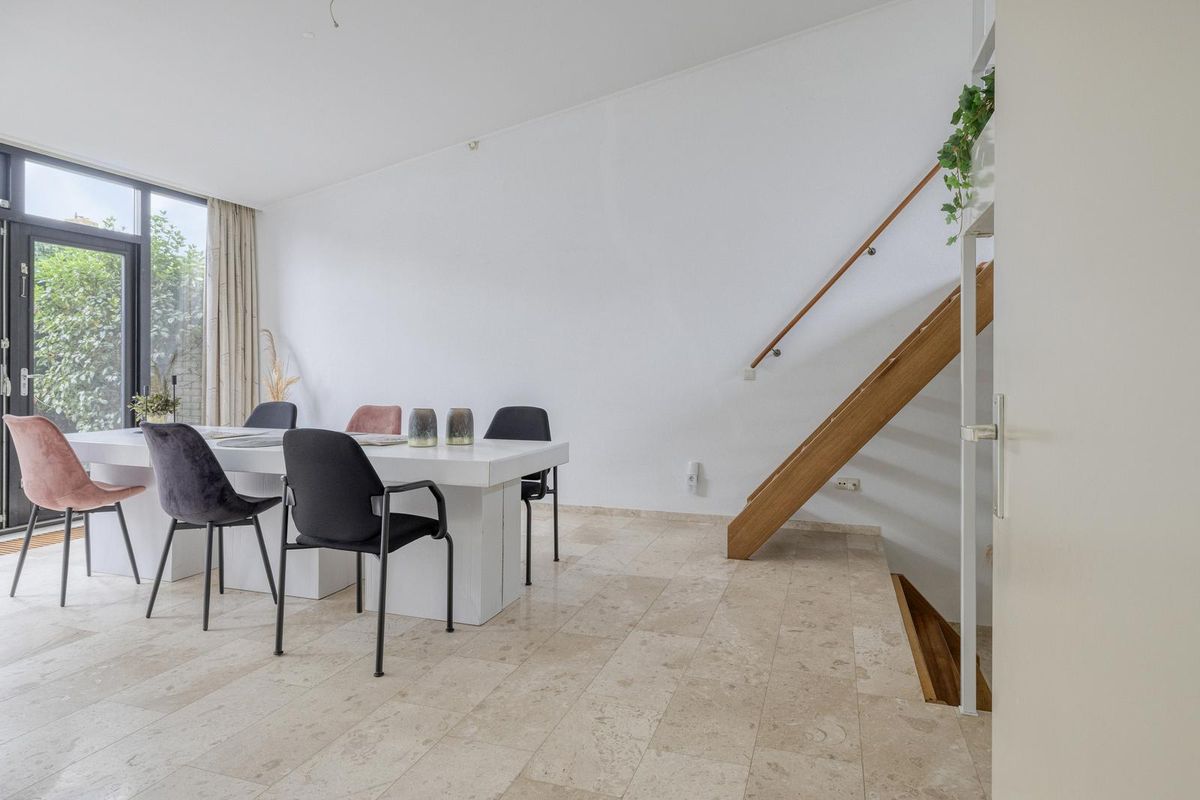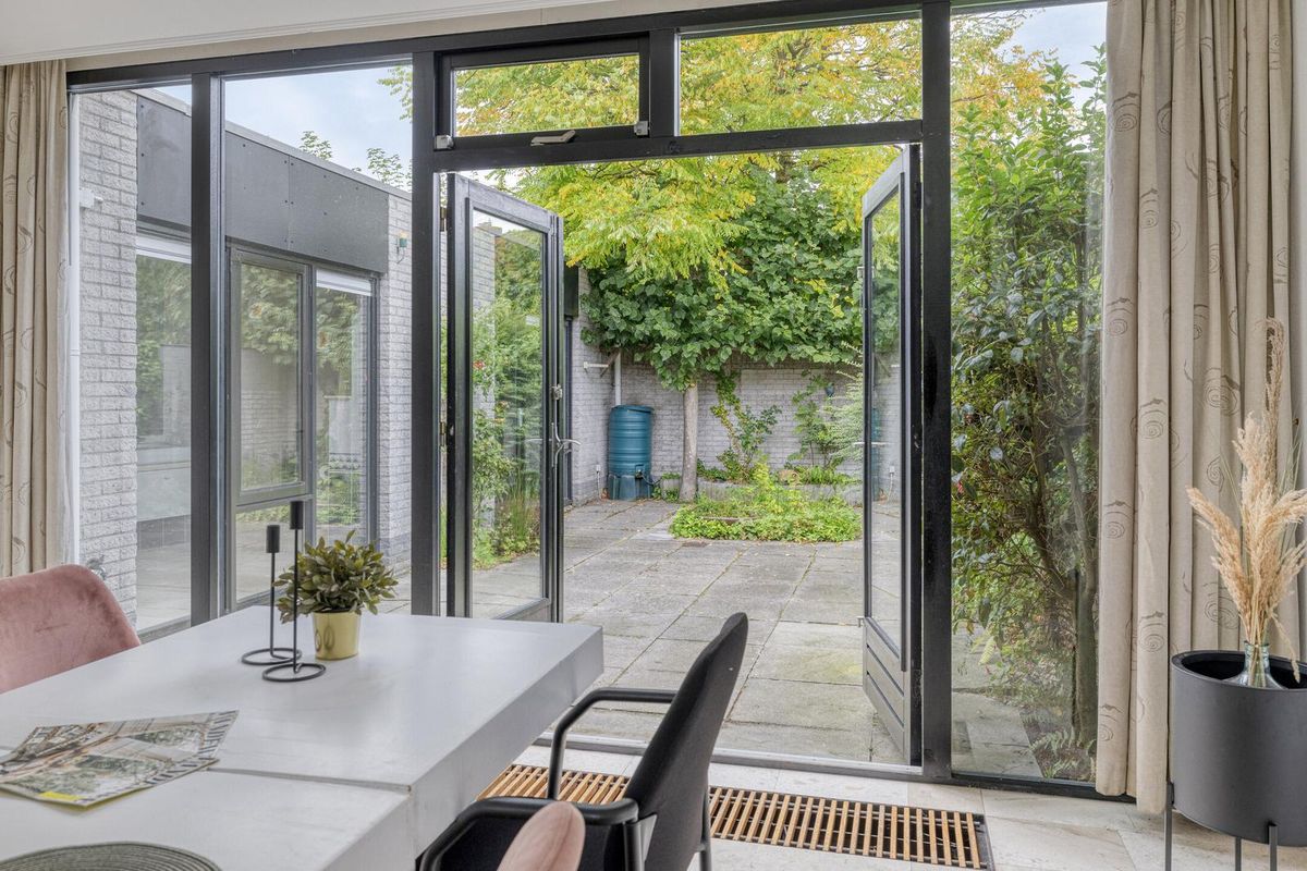 Het eetgedeelte staat via een loopdeur in verbinding met de keuken, en openslaande tuindeuren bieden directe toegang tot de tuin.