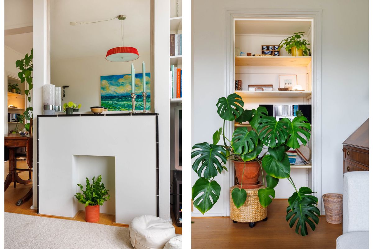 The large and sunny living room consists of two areas: a generous sitting area with a decorative mantelpiece and a dining area with access to a cozy front balcony.