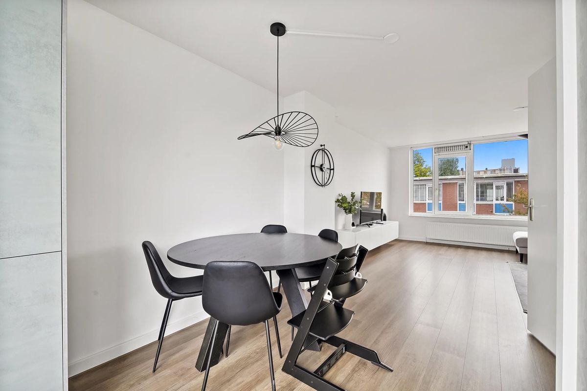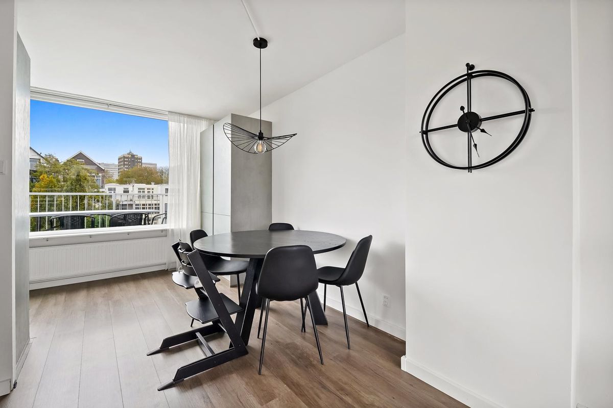 De derde verdieping vormt het hart van de woning: een lichte woonkamer met grote raampartijen en een halfopen keuken met gezellige eethoek.