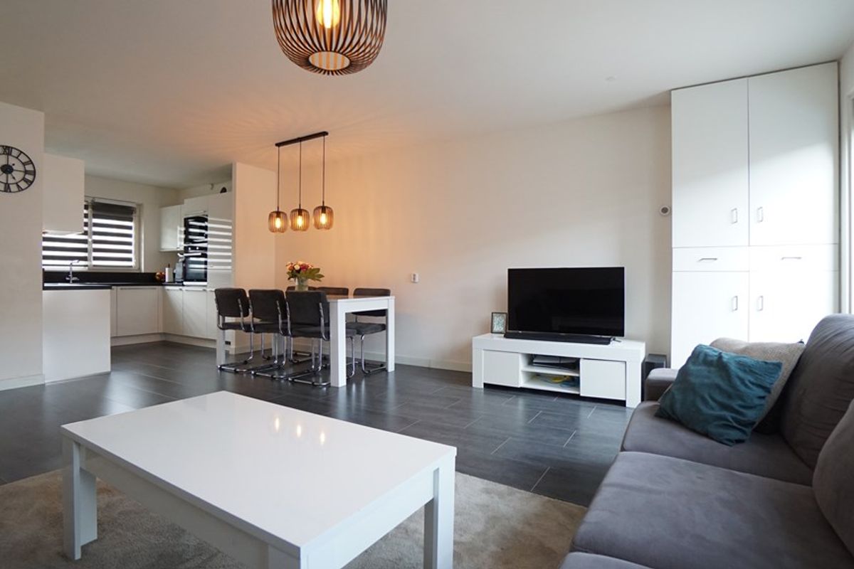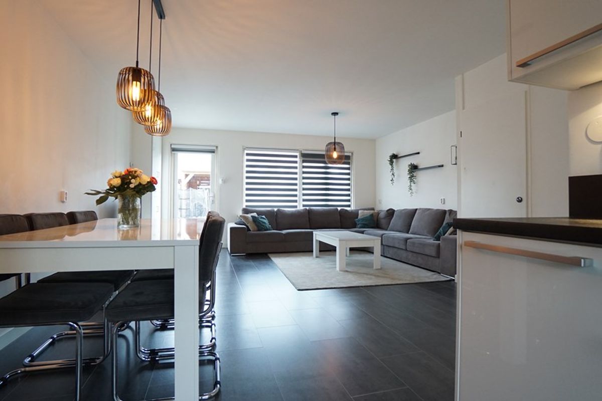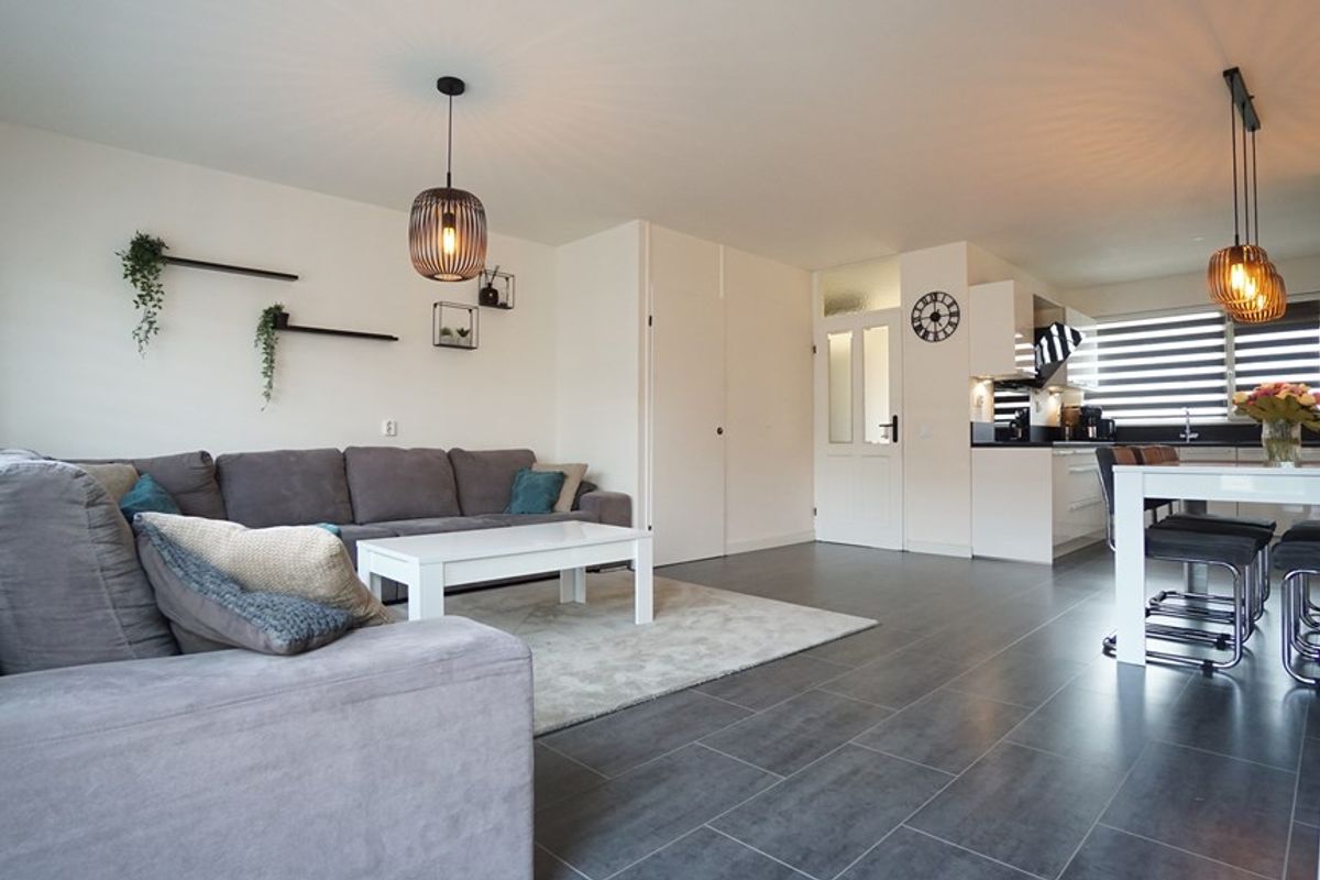 woonkamer. De woonkamer geeft een ruimtelijk gevoel dit mede omdat er een ruime open keuken is met vernieuwde inrichting. De begane grond is voorzien van laminaattegels.