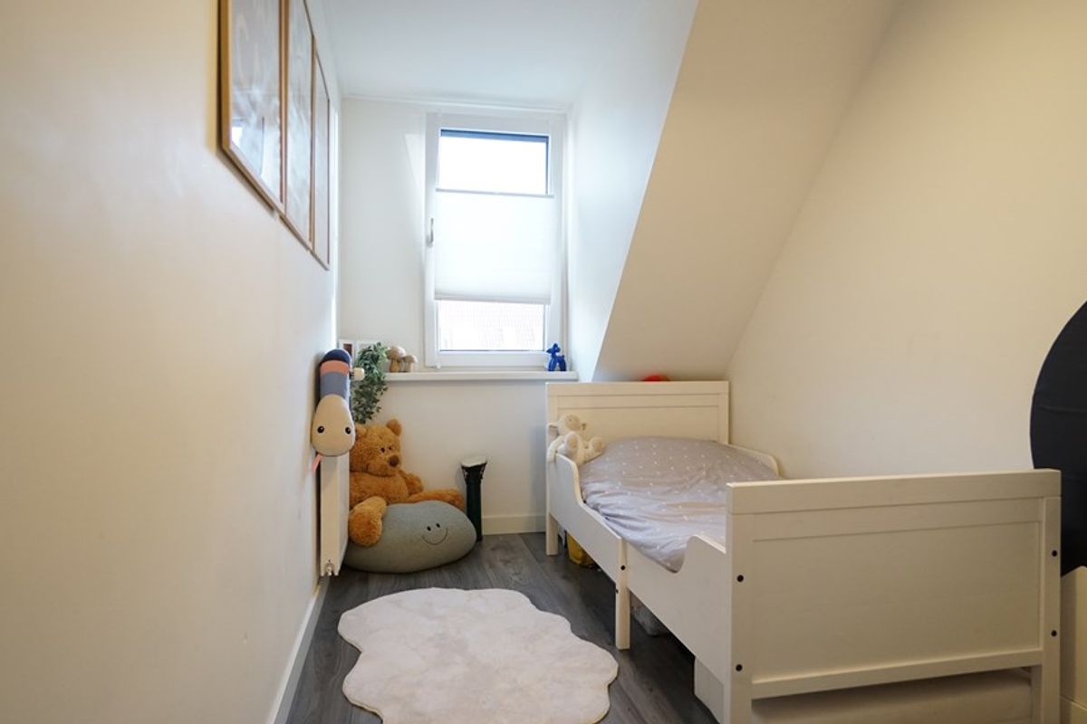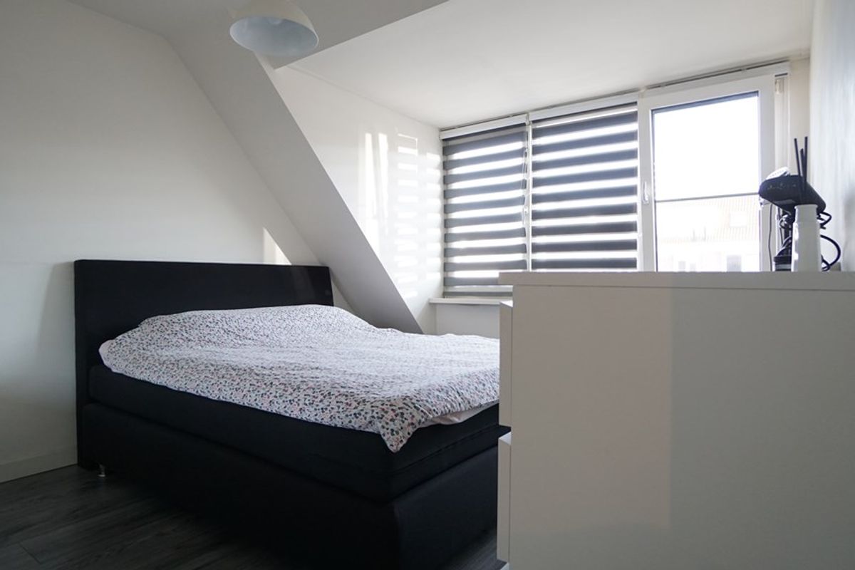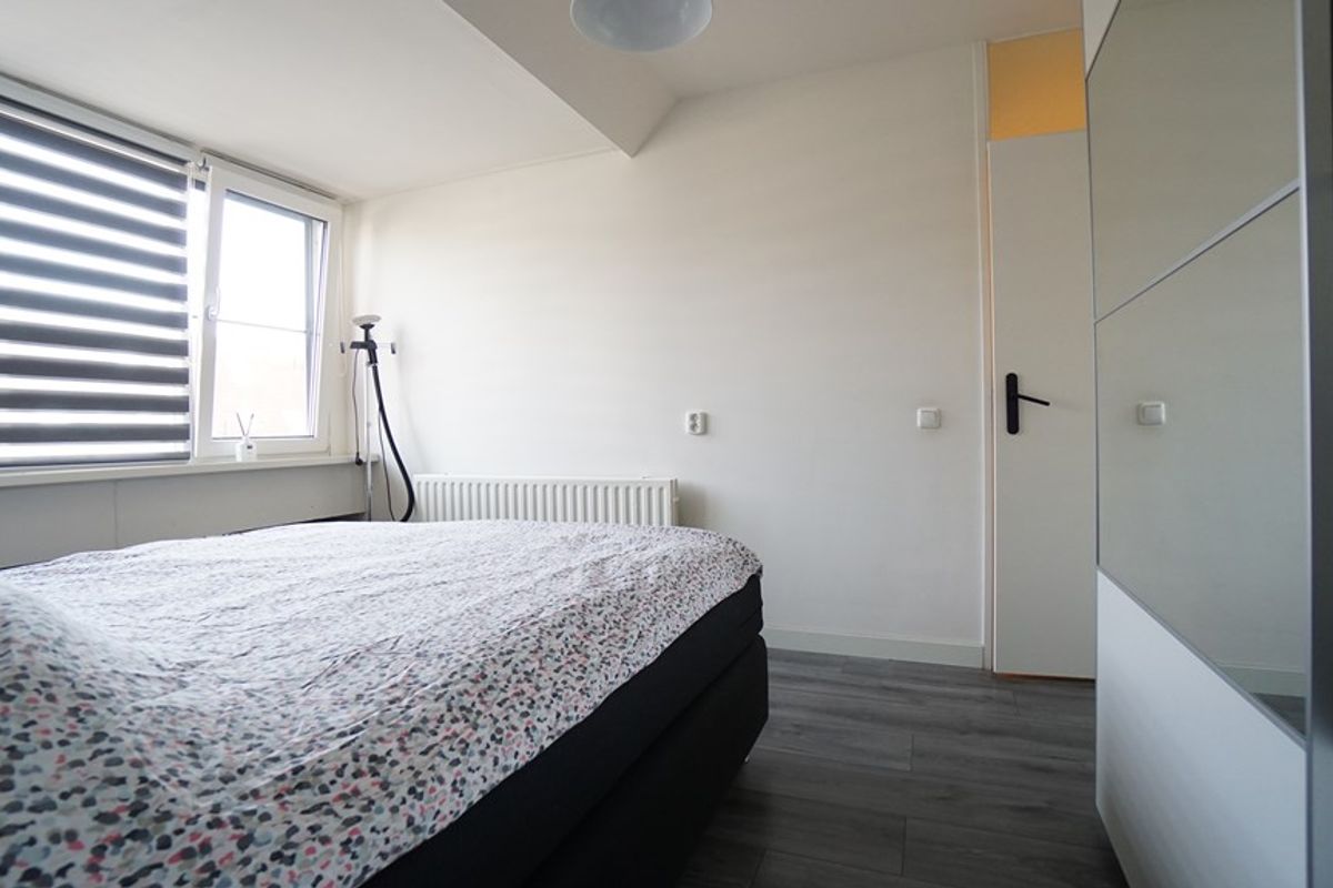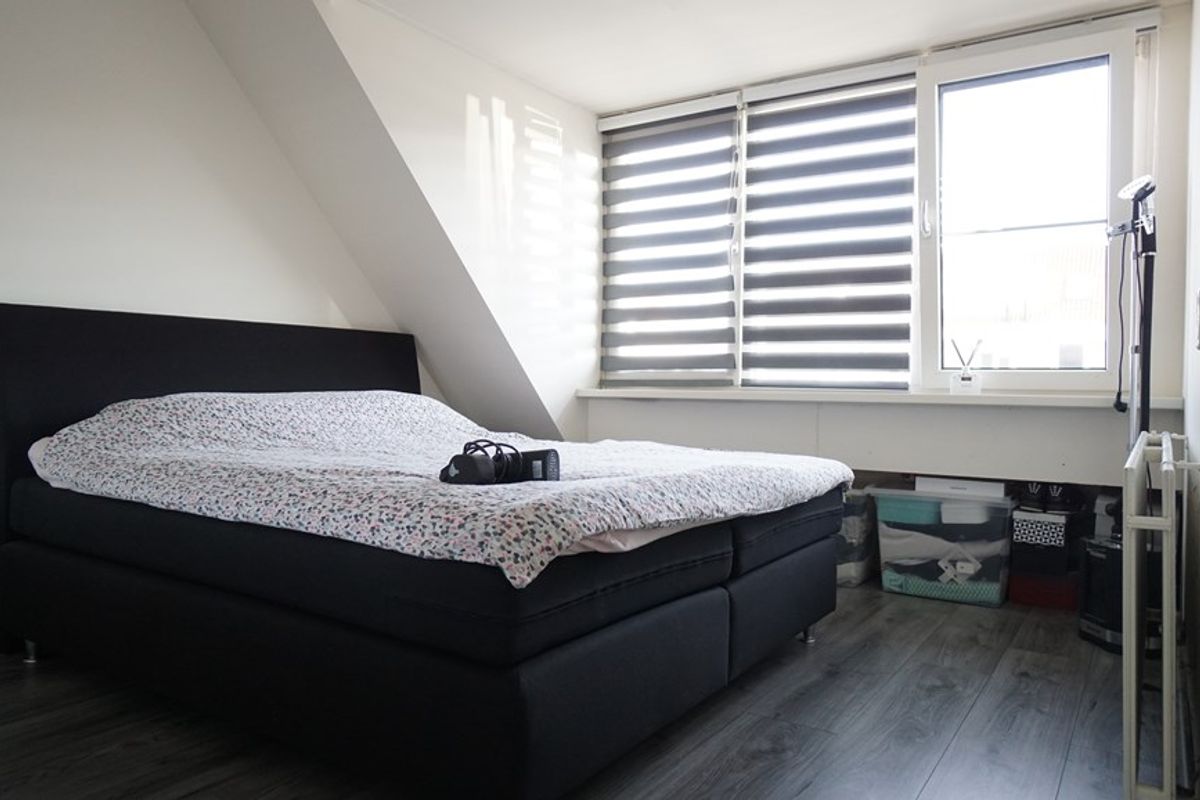 De verdieping heeft eveneens een mooie laminaatvloer met een wat warmere uitstraling. Er zijn twee grote slaapkamers van circa 12m² die beiden veel lichtinval bieden. De derde slaapkamer, groot circa 6m², kan gebruikt worden als studeer- of babykamer en maakt gebruik van de gedeelde dakkapel. De moderne badkamer die recent is vernieuwd biedt een comfortabel grote inloopdouche en wastafelmeubel met dubbele kraan. De achterzijde van de woning heeft over de grootste breedte een dakkapel voor extra stahoogte alsmede zonnescherm op de parterre.