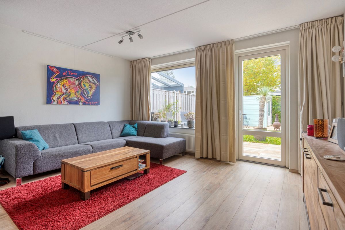 De woonkamer ligt aan de achterzijde en is voorzien van een strakke laminaatvloer, gladde wanden en een praktische bergkast. Via de loopdeur stap je zo de zonnige tuin in.