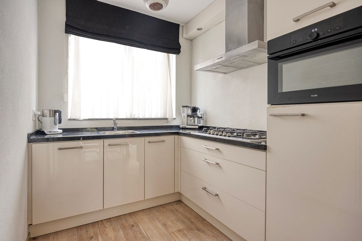 Aan de voorzijde bevindt zich de moderne open keuken, uitgevoerd in wit met een antraciet werkblad en voorzien van alle gemakken: gasfornuis, RVS-afzuigkap, koelkast en vaatwasser.