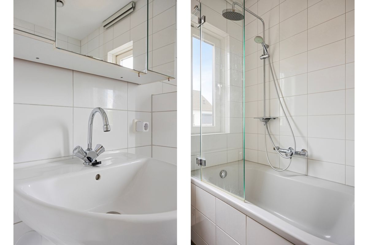 De badkamer is modern, volledig betegeld en uitgerust met een ligbad/douchecombinatie, tweede toilet en wastafel in een eigentijdse kleurstelling.
