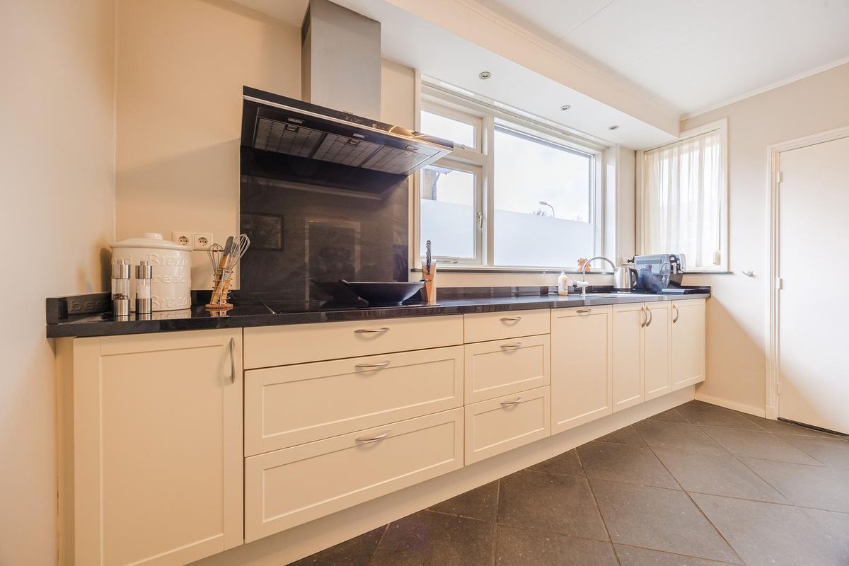 De ruime leefkeuken is voorzien van een tegelvloer, gestucte wanden een natuurstenen blad en inbouwapparatuur: inductie kookplaat, afzuigkap, oven, vaatwasser en een koelkast. Vanuit de keuken heeft u toegang tot de kelderkast en bijkeuken.