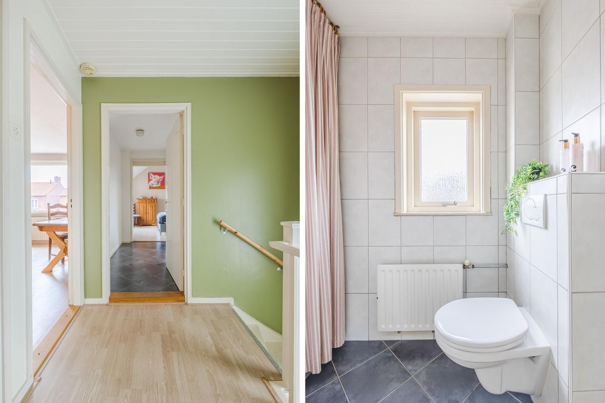Via de trap komt u op de overloop met laminaatvloer. De overloop bestaat uit 2 delen, het achterste deel is voorzien van een tegelvloer en biedt toegang tot de 3e slaapkamer en de badkamer.